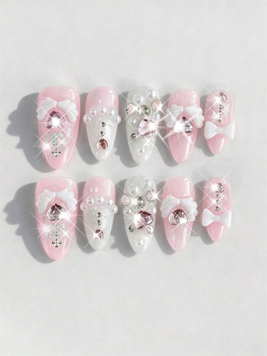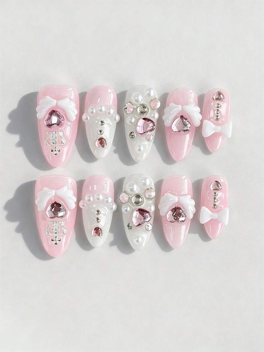 Kawaii 10 Stück süße Schleifen Fake Nägel + 3 Blatt doppelseitiger Kleber, abnehmbare rosa-farbene handbemalte Nagel-Aufkleber, wiederverwendbare Nail Arts geeignet für Feiertage, Partys, Tanzen und den täglichen Gebrauch, Valentinstag