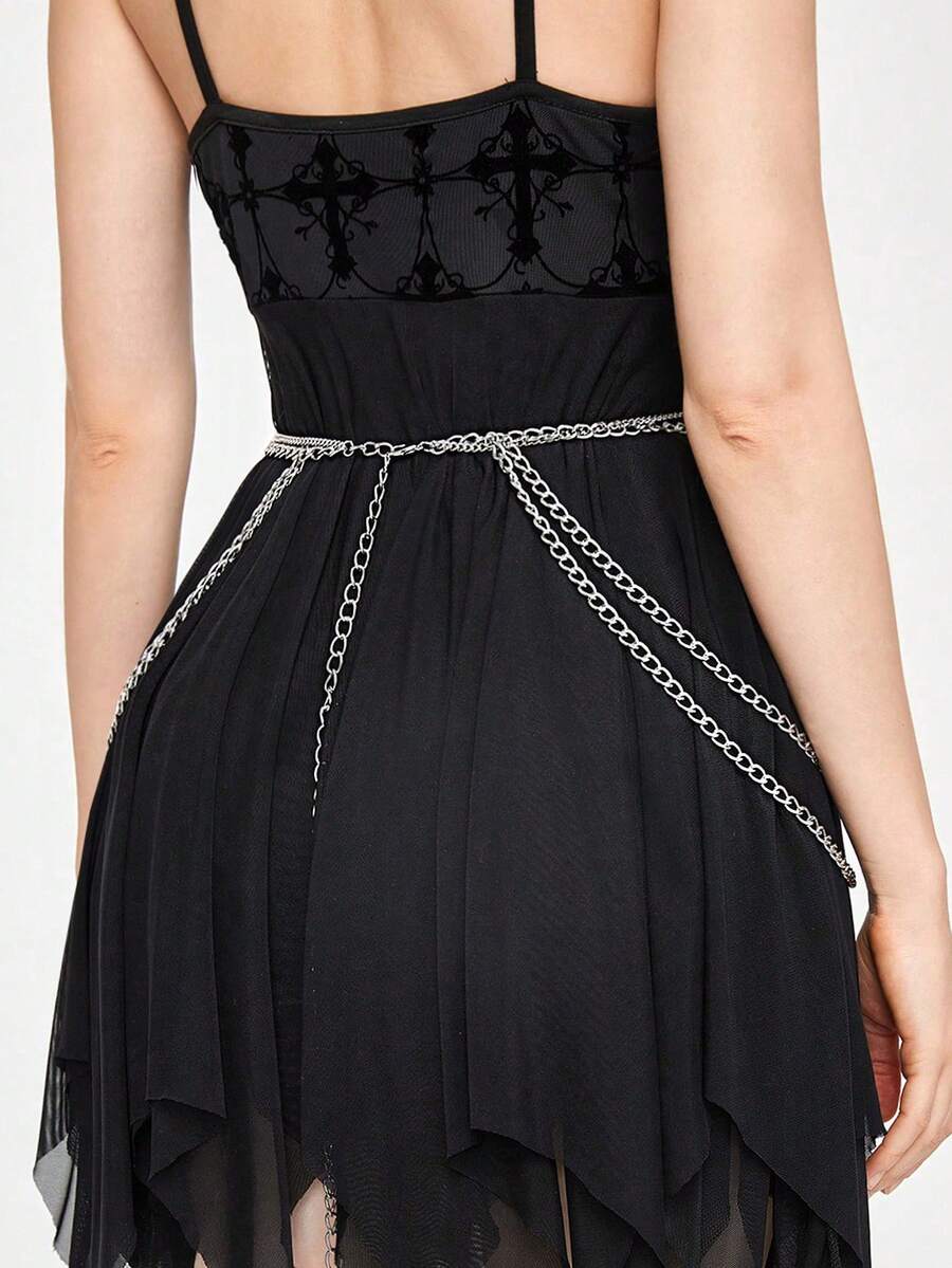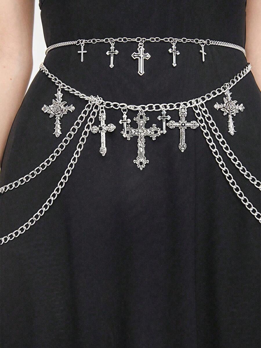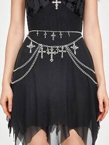 1 Stück Damen Gothic Stil Silber & Schwarz Kreuz geschichtete Kette Taille Kette Kleid Accessoire, vielseitig für Alltag, Halloween