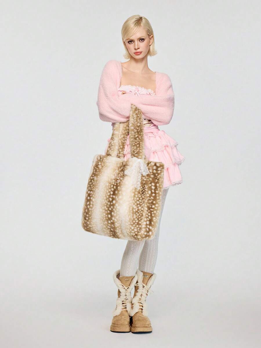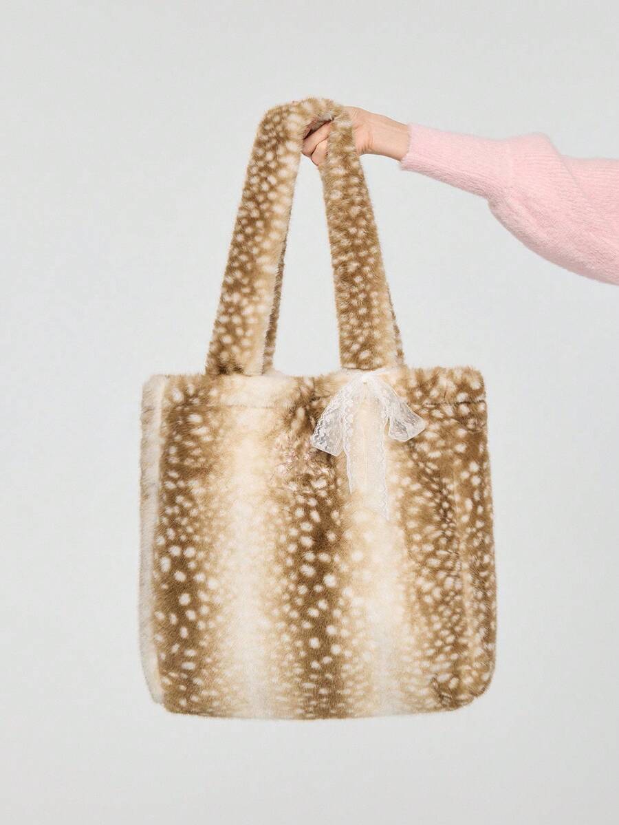 Fairycore 1 Stück Damen Hochwertiger Hirsch Plüsch Große Kapazität Schultertasche mit Schleifenband