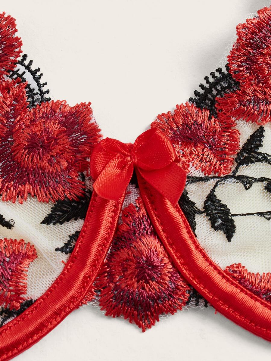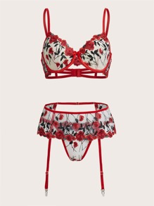 3 Stücke/set Damen Sexy Dessous Mit Rose Stickerei Stahlring Bh, G-string Höschen Und Strumpfhalter Für Valentinstag