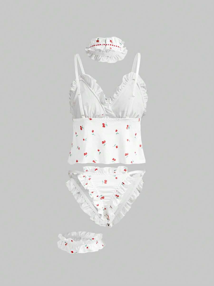 4 Stücke Kawaii Puppen Stil süße Valentinstag niedliche Schleife, Kirsche, Organza Jacquard sexy Dessous Set
