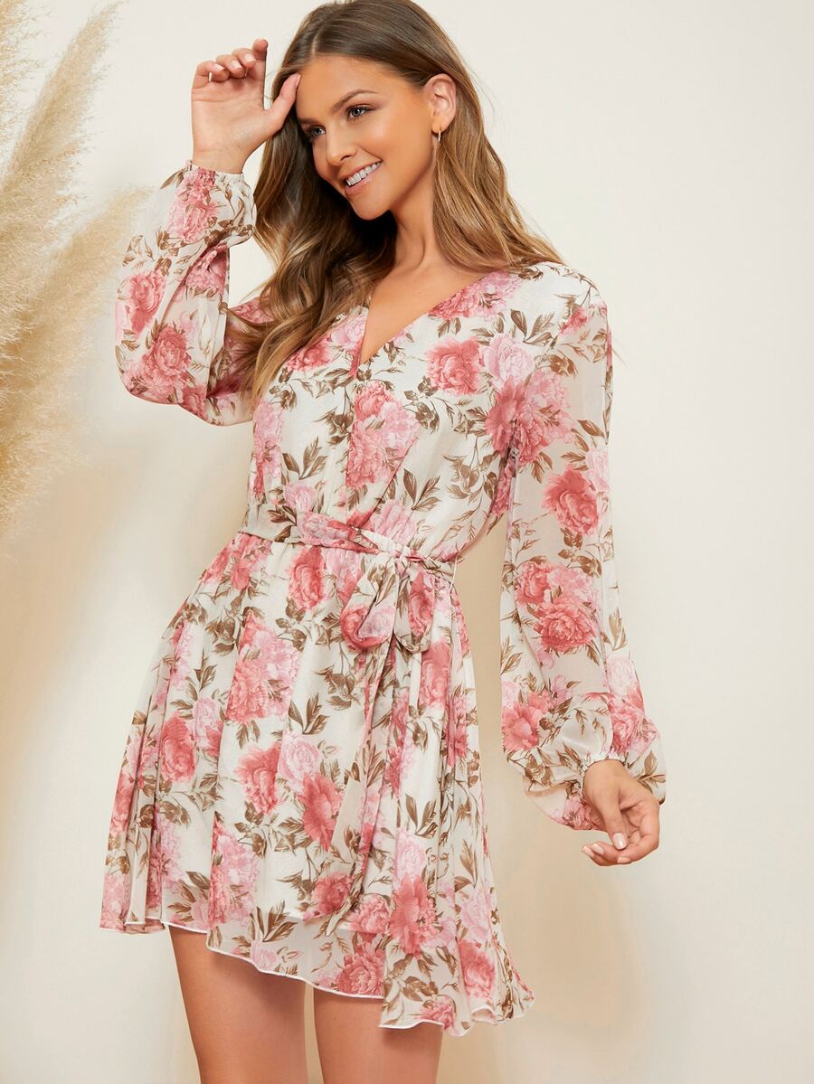Chiffon Kleid mit Blumen Muster, Laternenärmeln und Gürtel