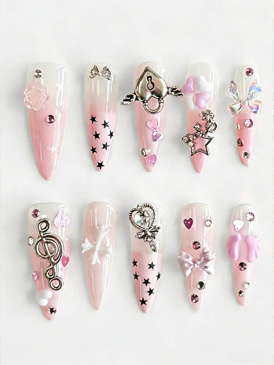 Anime 10 süße rosa Schleifen, Rosen, Musiknoten, Flügel, Sterne, Kreuz Liebeselemente handgemachte Fake Nägel + 3 doppelseitiges Klebeband, Y2K Stil Diamant, kontrastierende Farbnägel, abnehmbare lang mandelförmige Tragenägel, geeignet für Partys, Tänze und den täglichen Gebrauch.