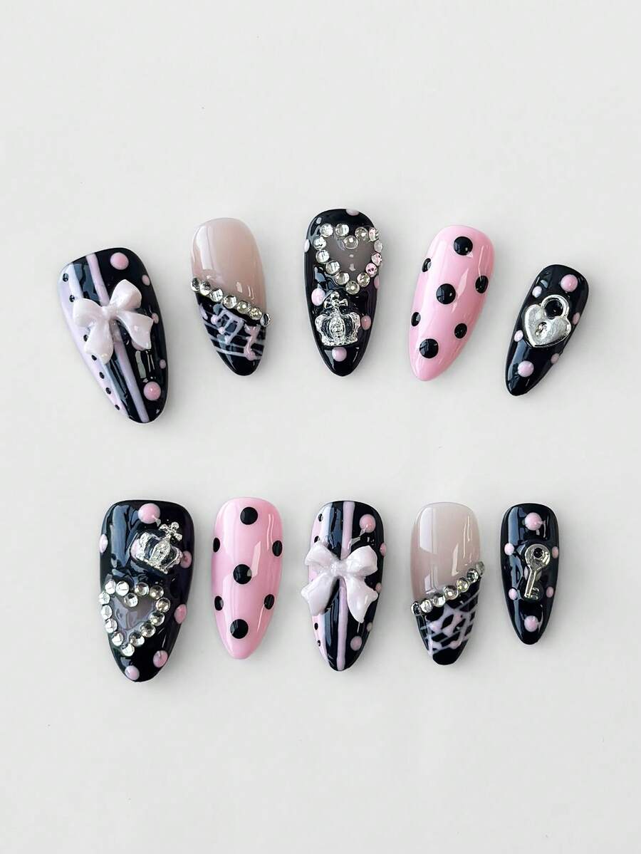 Anime 10 Stück süße Schleifen-Musik-Noten-Stern-Elemente hochwertige handgefertigte Kunstnägel + 3 Stück doppelseitiger Kleber, Y2K französischer Stil Strass-Kette Polka-Punkt abnehmbare Nail-Art-Aufkleber, geeignet für Feiertage, Partys, Tanzen und den täglichen Gebrauch