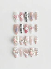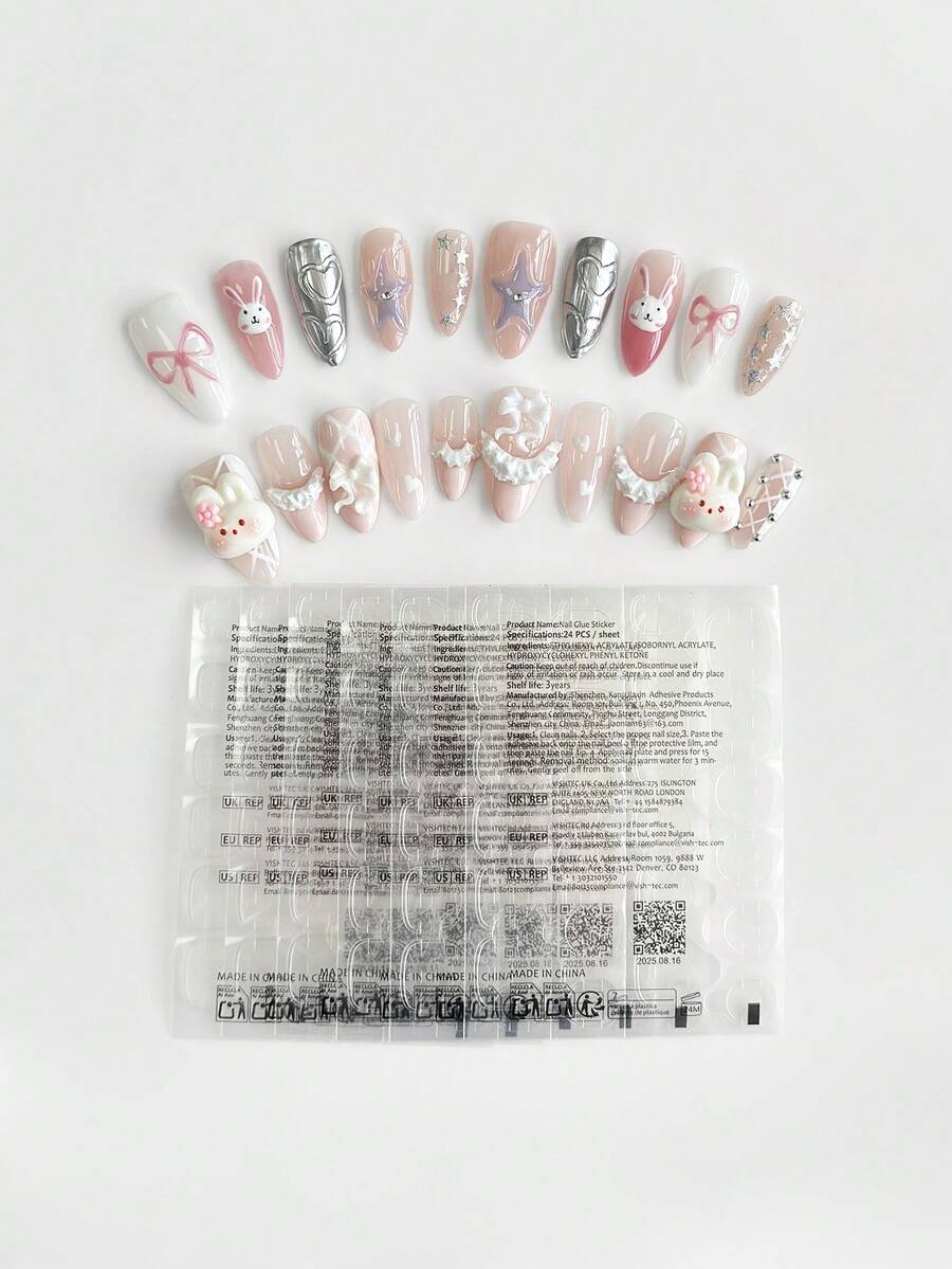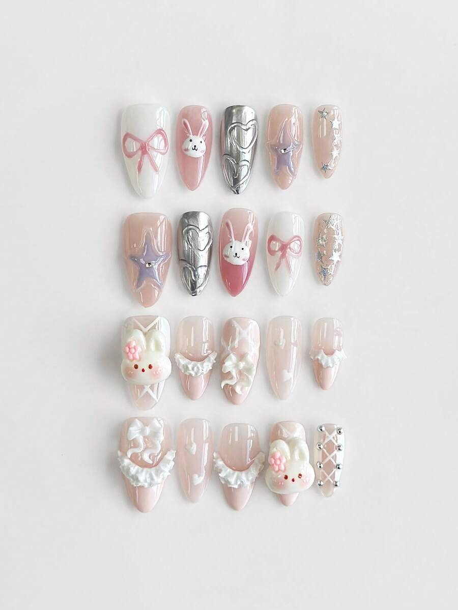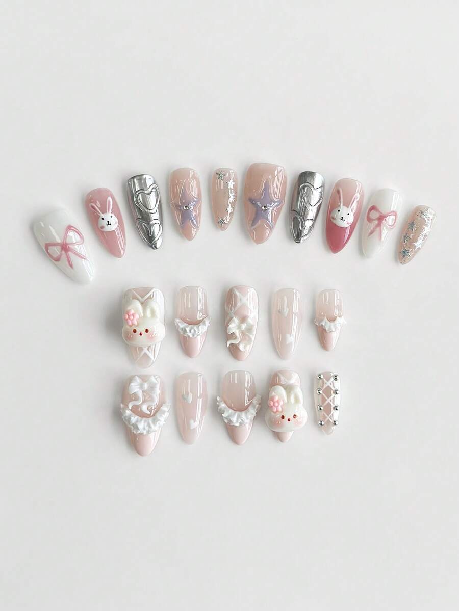 Anime 10 Stück süße Flügel, Rose, Schleife, Musiknote, Stern Element hochwertige handgefertigte Kunstnägel + 3 Stück doppelseitiger Kleber, Y2K Stil Strass rosa Polka Punkt weiße Spitze abnehmbare Maniküre Aufkleber, geeignet für Feiertage, Partys, Tanzen und den täglichen Gebrauch