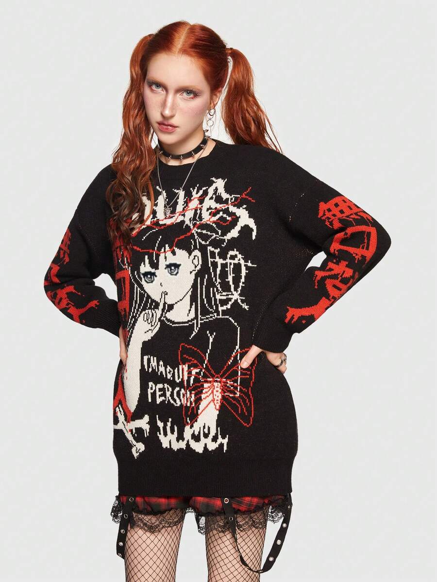 Anime Pullover mit Figur & Buchstabe Muster, Drop Shoulder