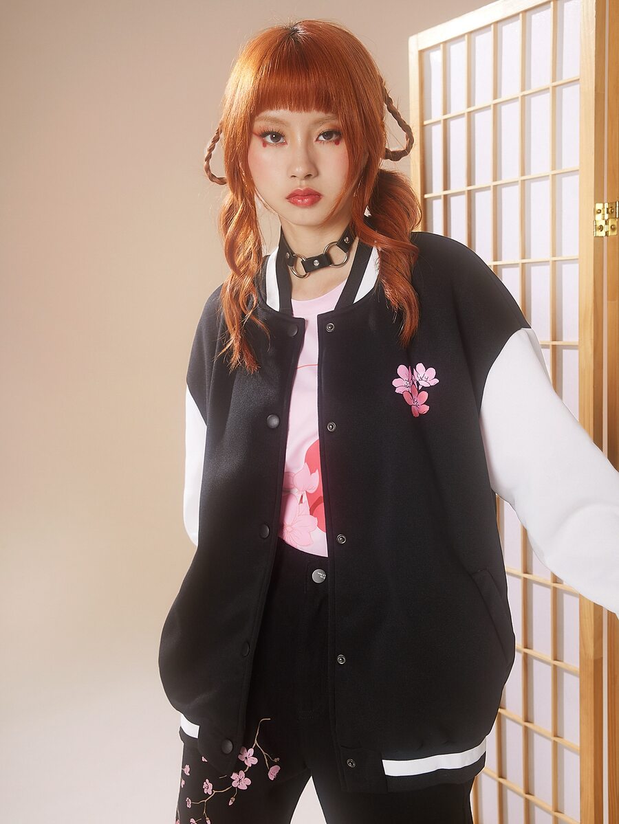 Anime College Jacke mit Blume & Fuchs Grafik, Drop Shoulder