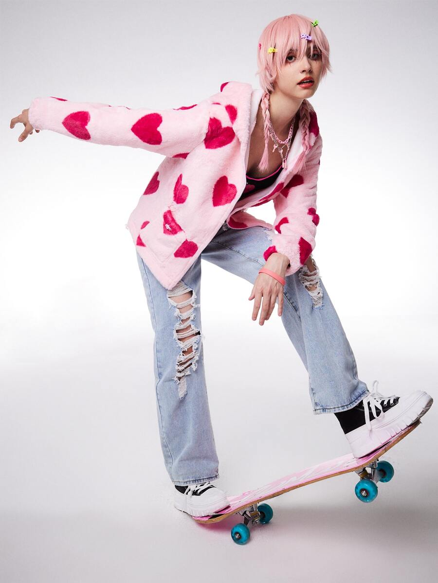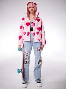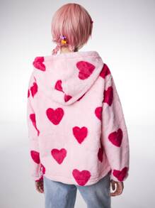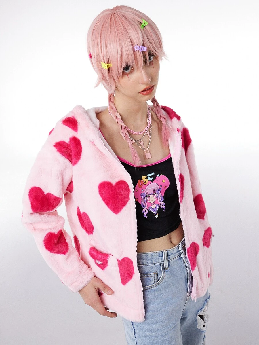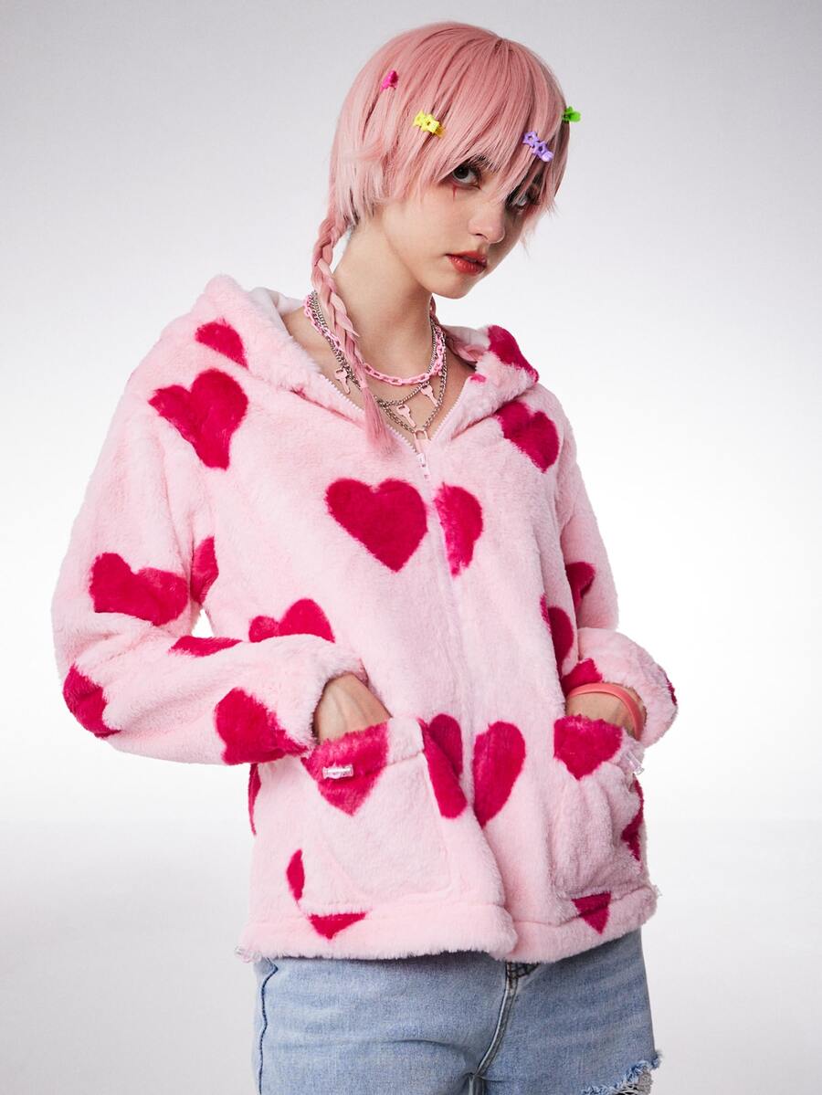Anime Mantel mit Herzen Muster, Reißverschluss, fusselig