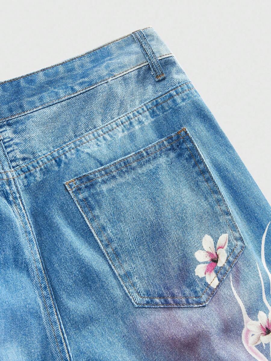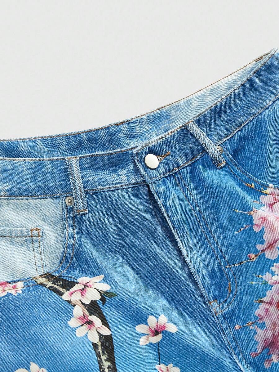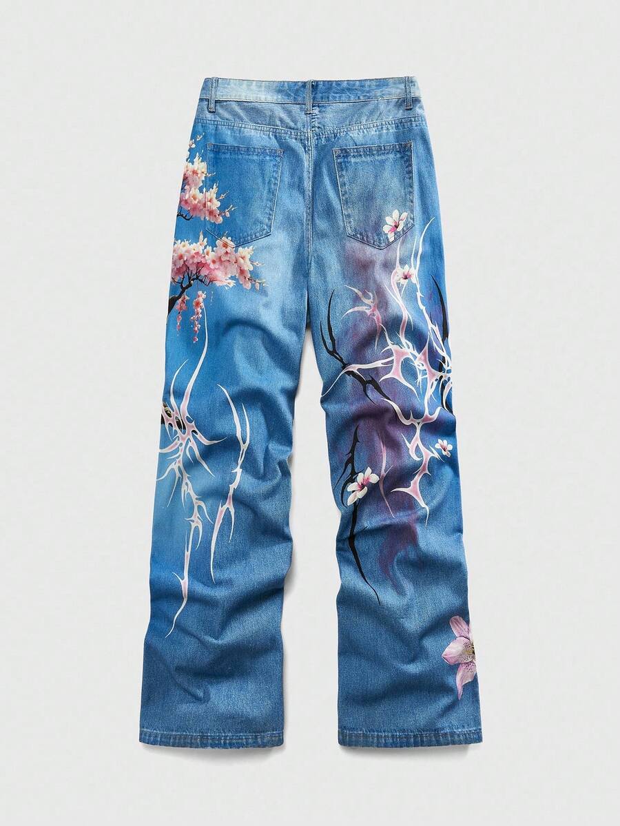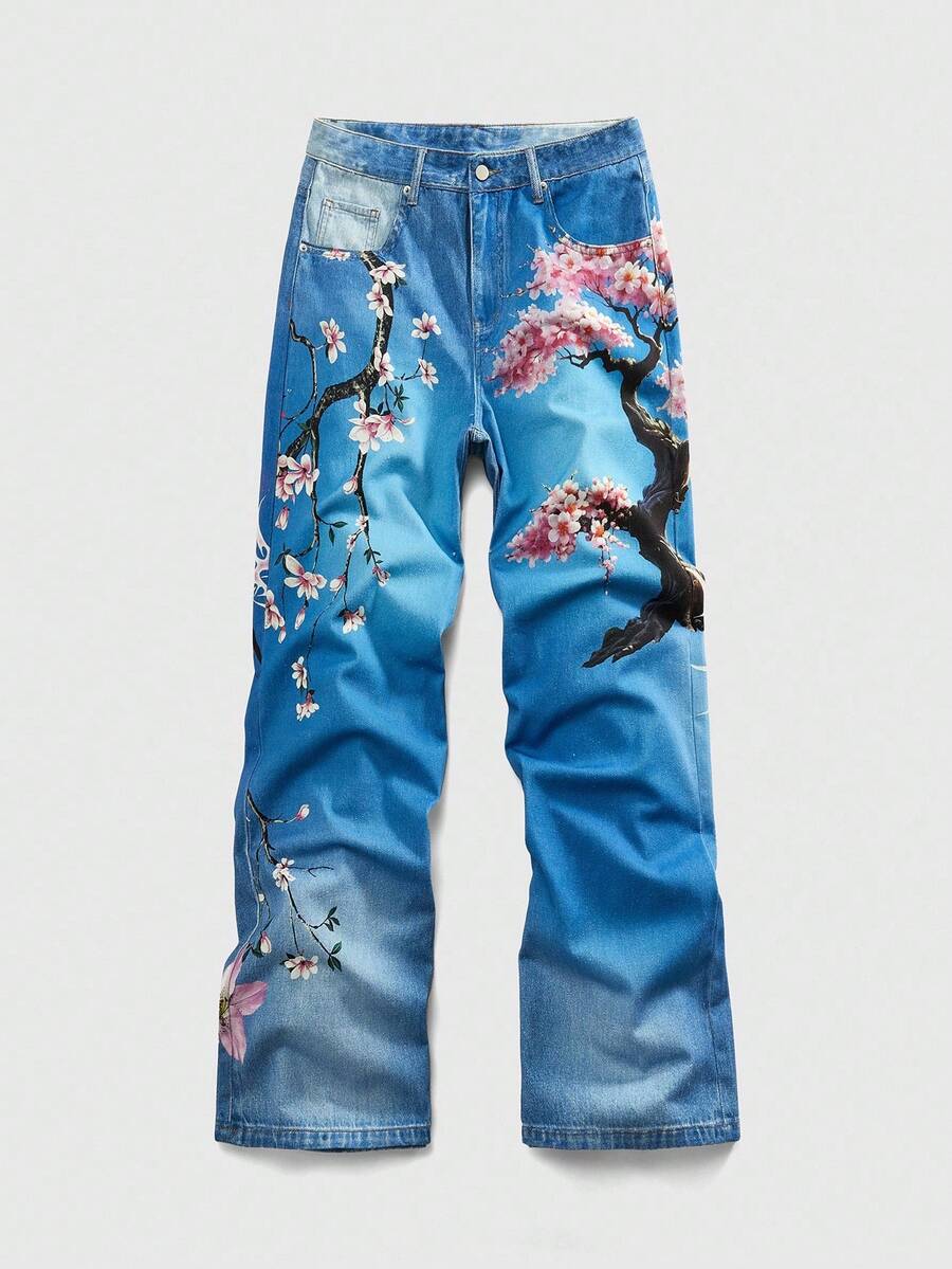 Anime Herren Lässig Loose Fit Jeans mit Baum-Muster und Tasche, weites Bein
