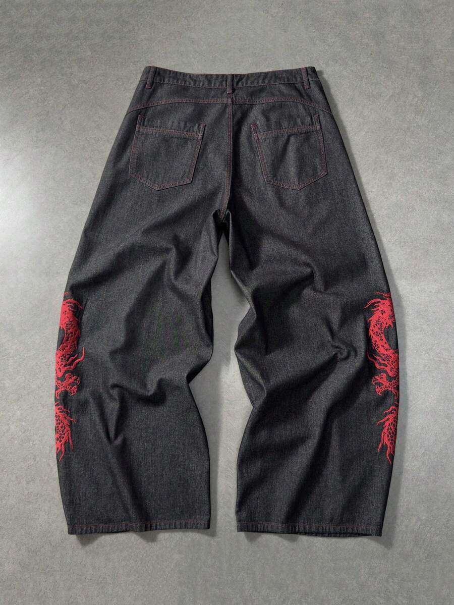 Anime Herren Jeans mit chinesischem Drachenmuster, Knopfleiste, Taschen und weitem Bein, Lässig