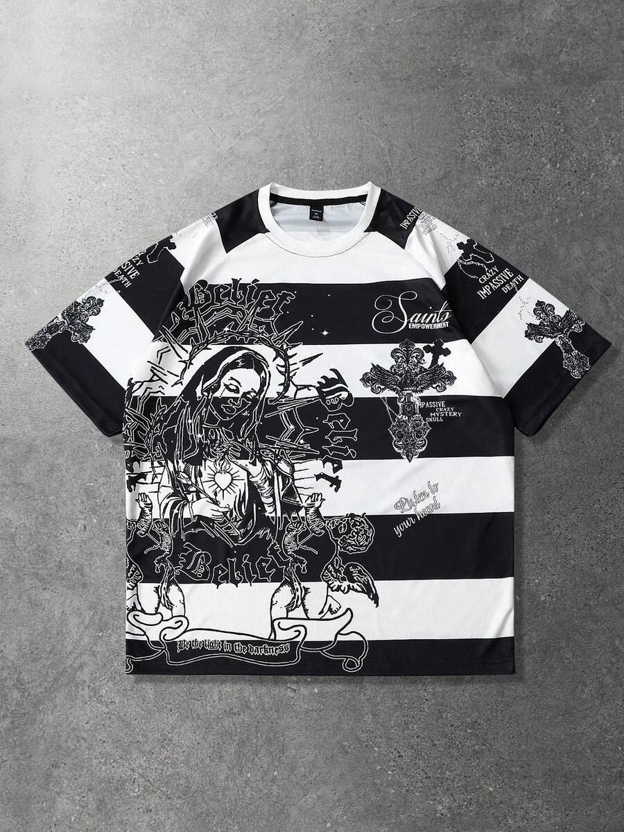 Anime Herren T-Shirt mit Buchstaben- und Streifendruck, Rundhalsausschnitt, Raglanärmel, Kurzarm