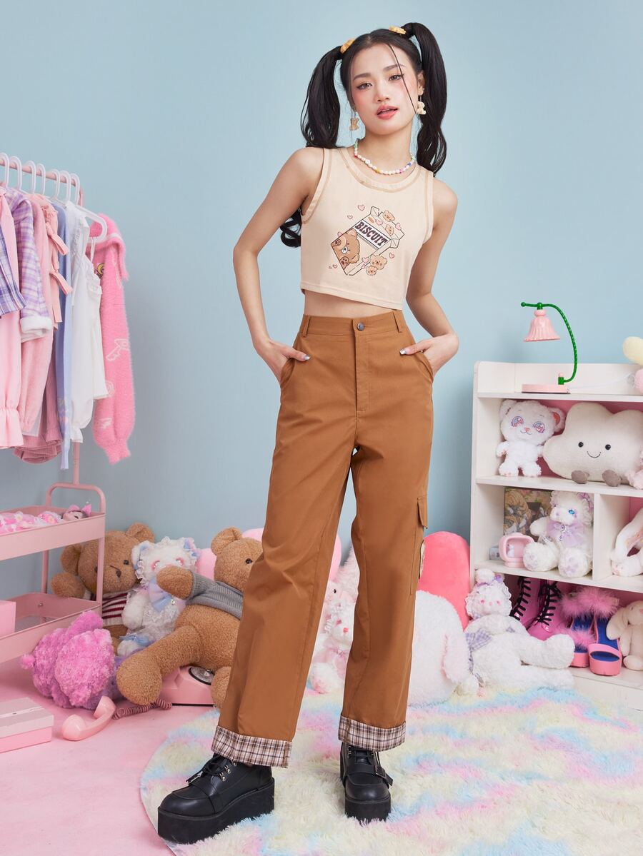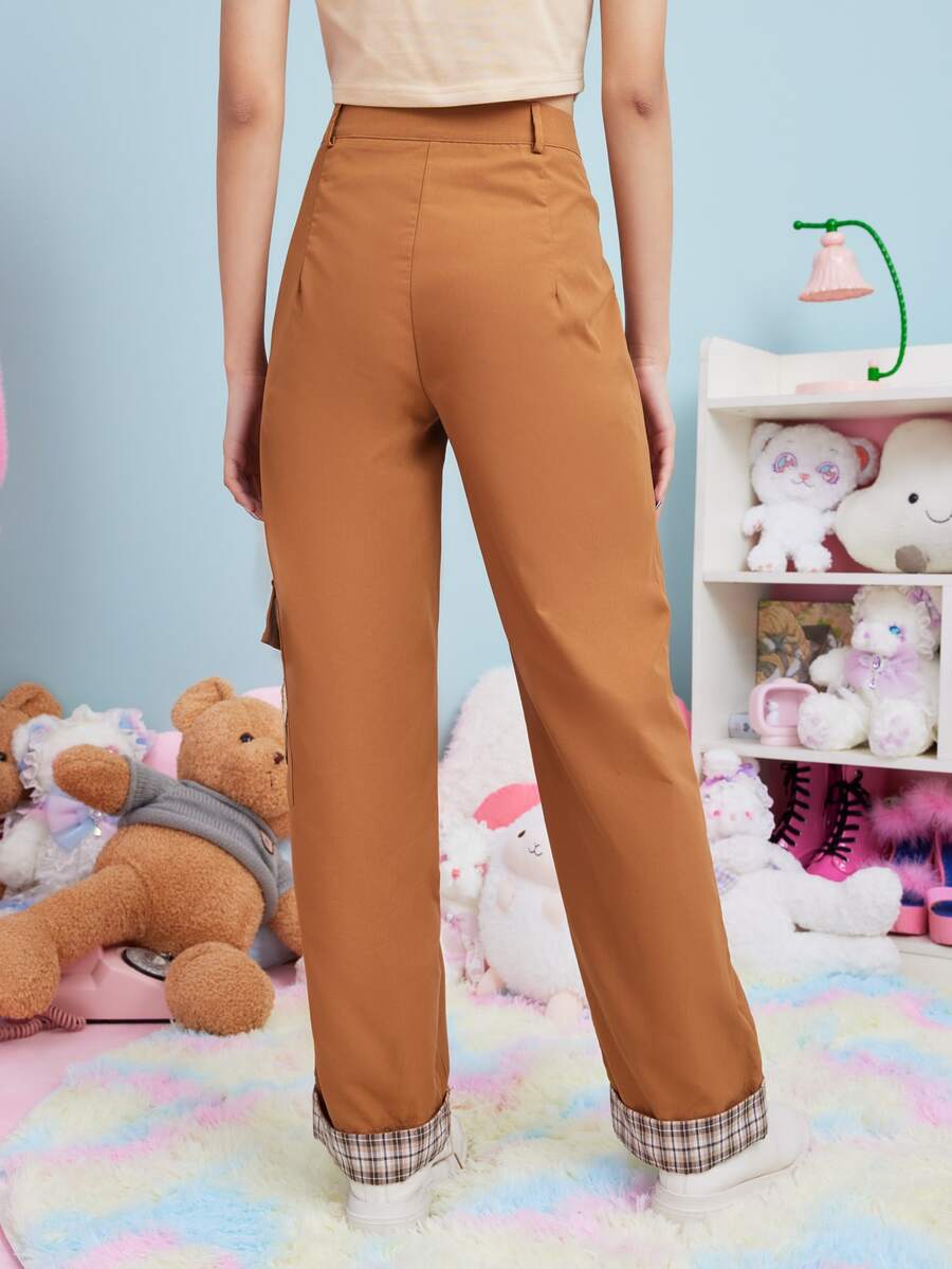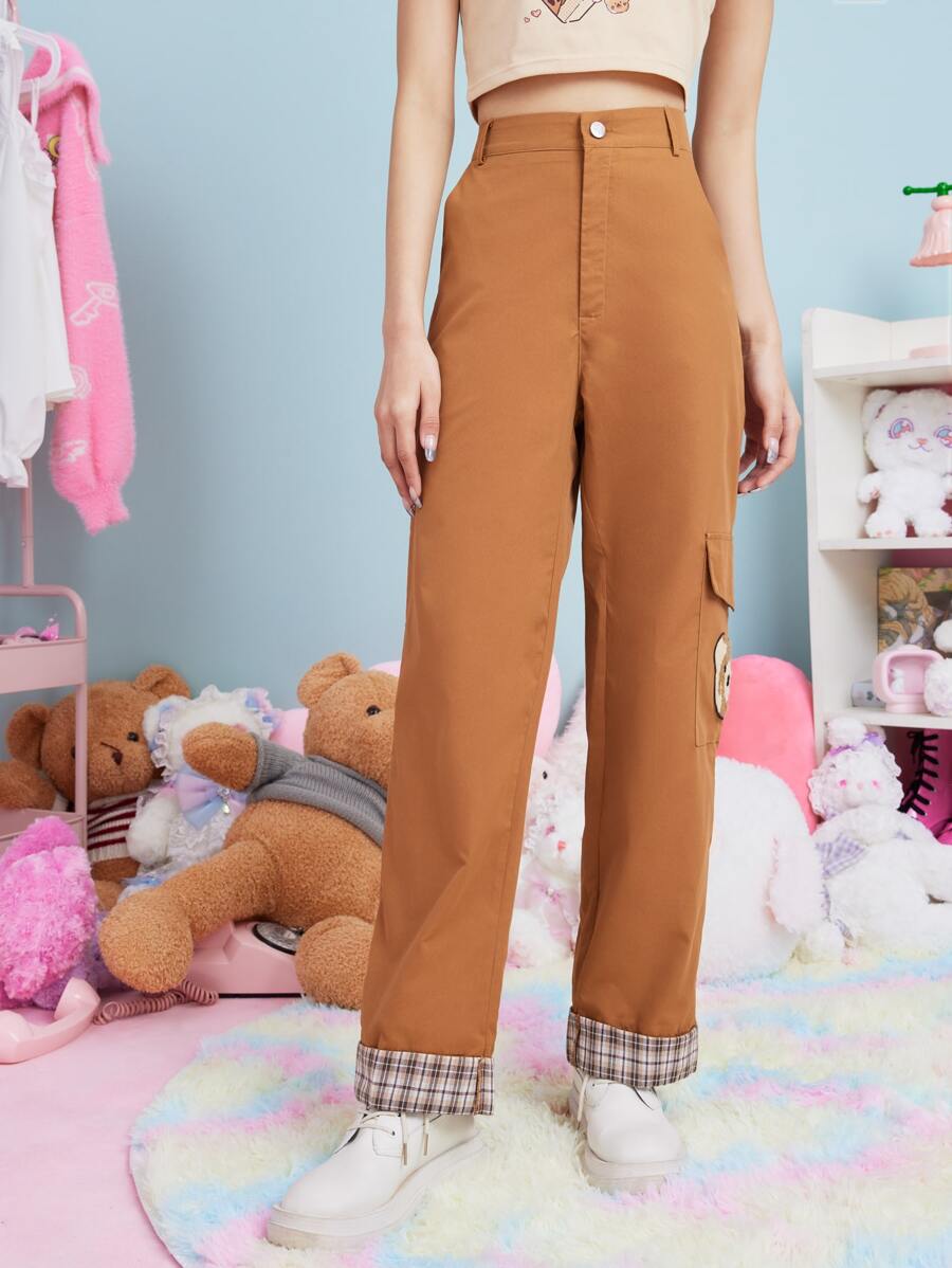 Anime Cargo Hose mit Plaid Muster, Cartoon Bär Flicken