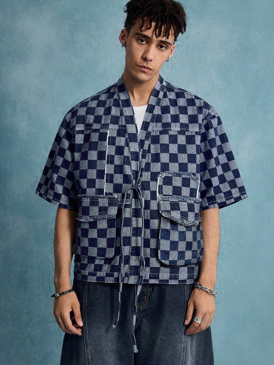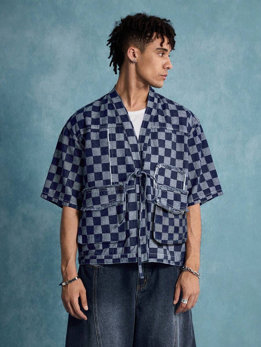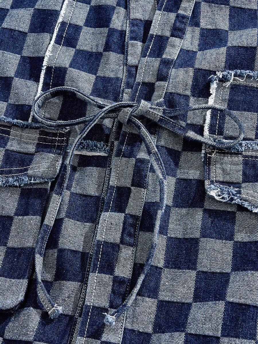 Anime Herren lässiges Jeanshemd mit Vorderteil-Karo-Muster und Krawatte, kurzärmlig, Sommer
