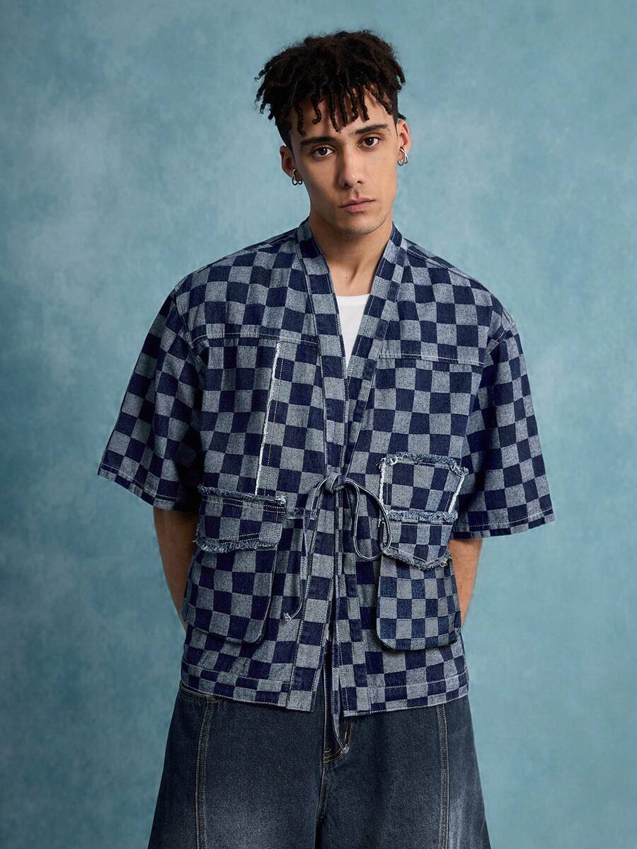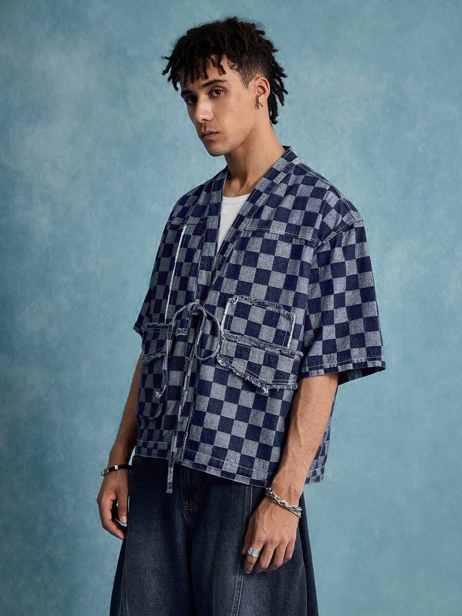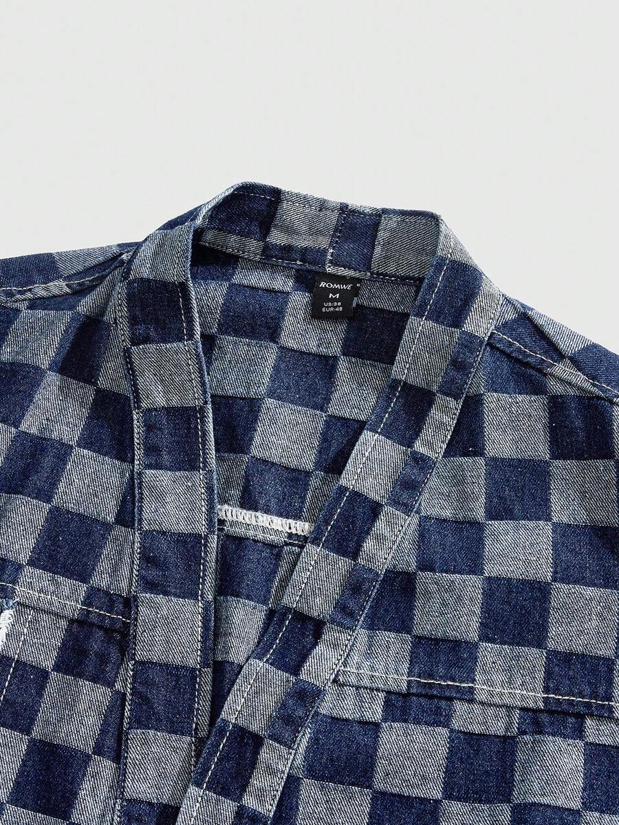 Anime Herren lässiges Jeanshemd mit Vorderteil-Karo-Muster und Krawatte, kurzärmlig, Sommer