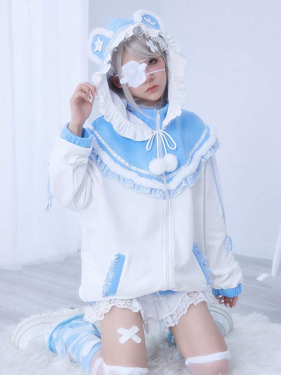 Anime Damen süßer zweifarbiger Spitzenbesatz Bären Ohren 2D Kapuzen-Sweatshirt