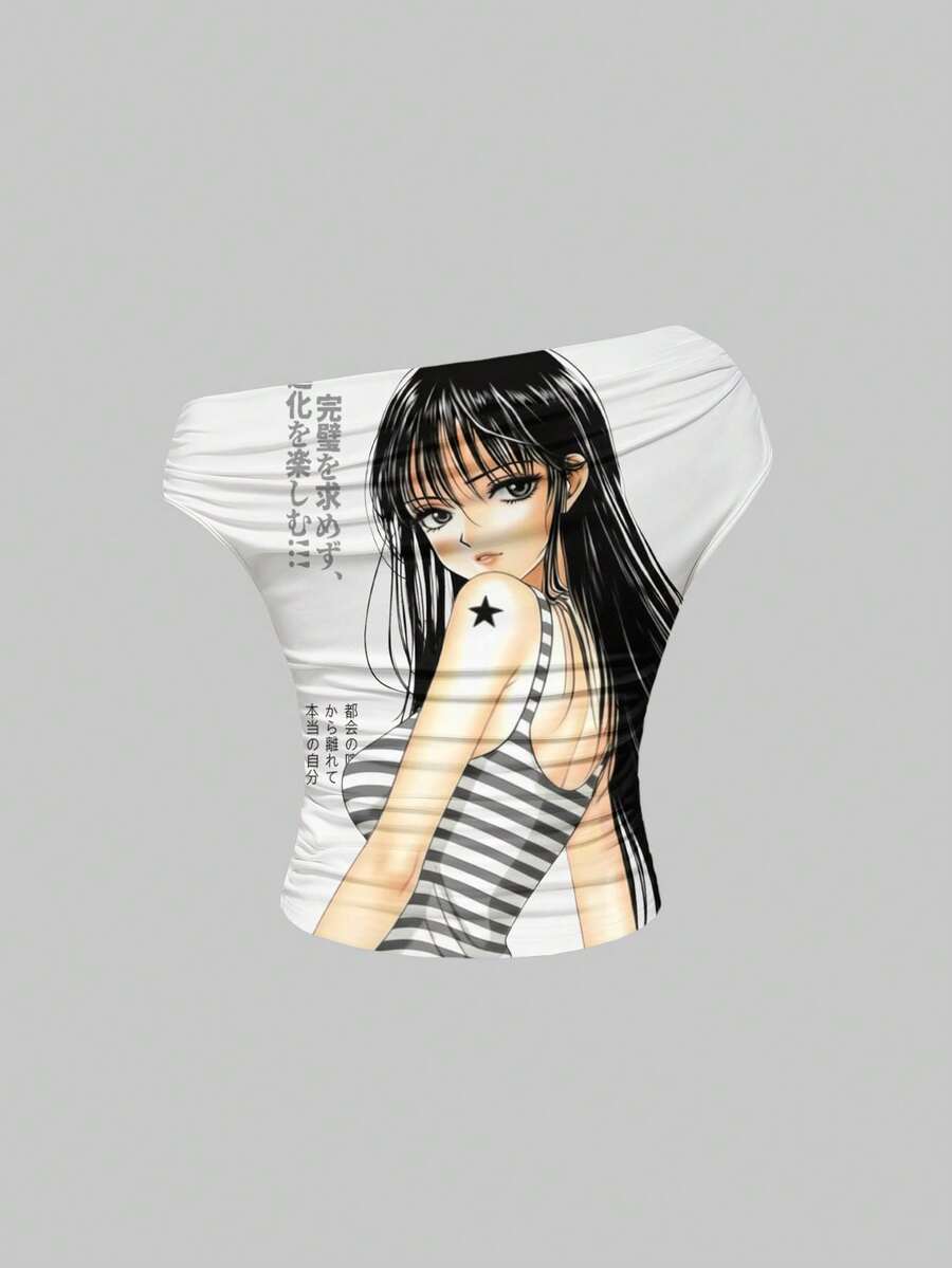 Anime Damen Schräg Schulter Gerafftes Cartoon Muster Figurbetontes Lässig T-Shirt