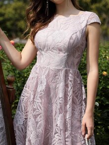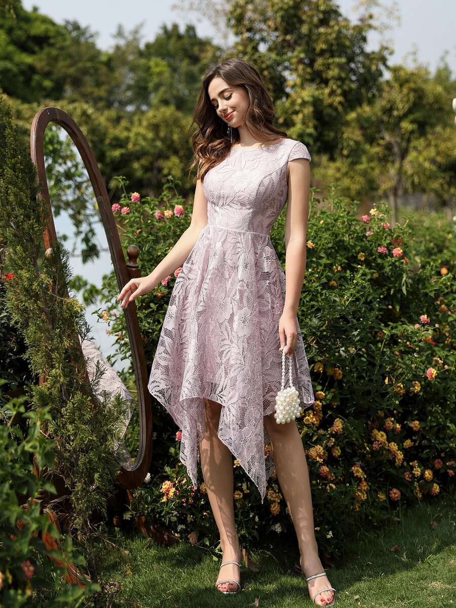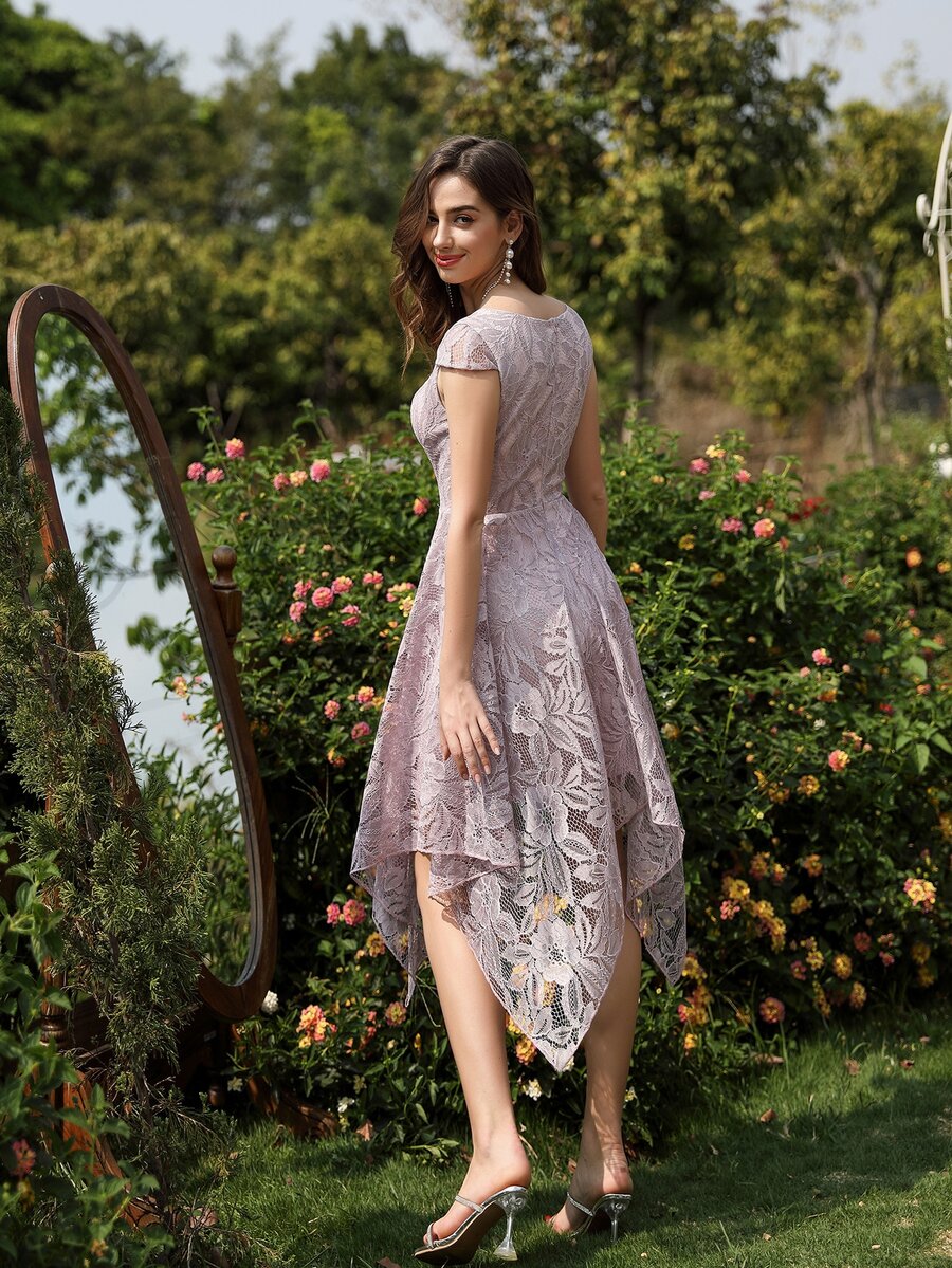 Einfarbiges Kleid mit asymmetrischem Saum und Spitzen