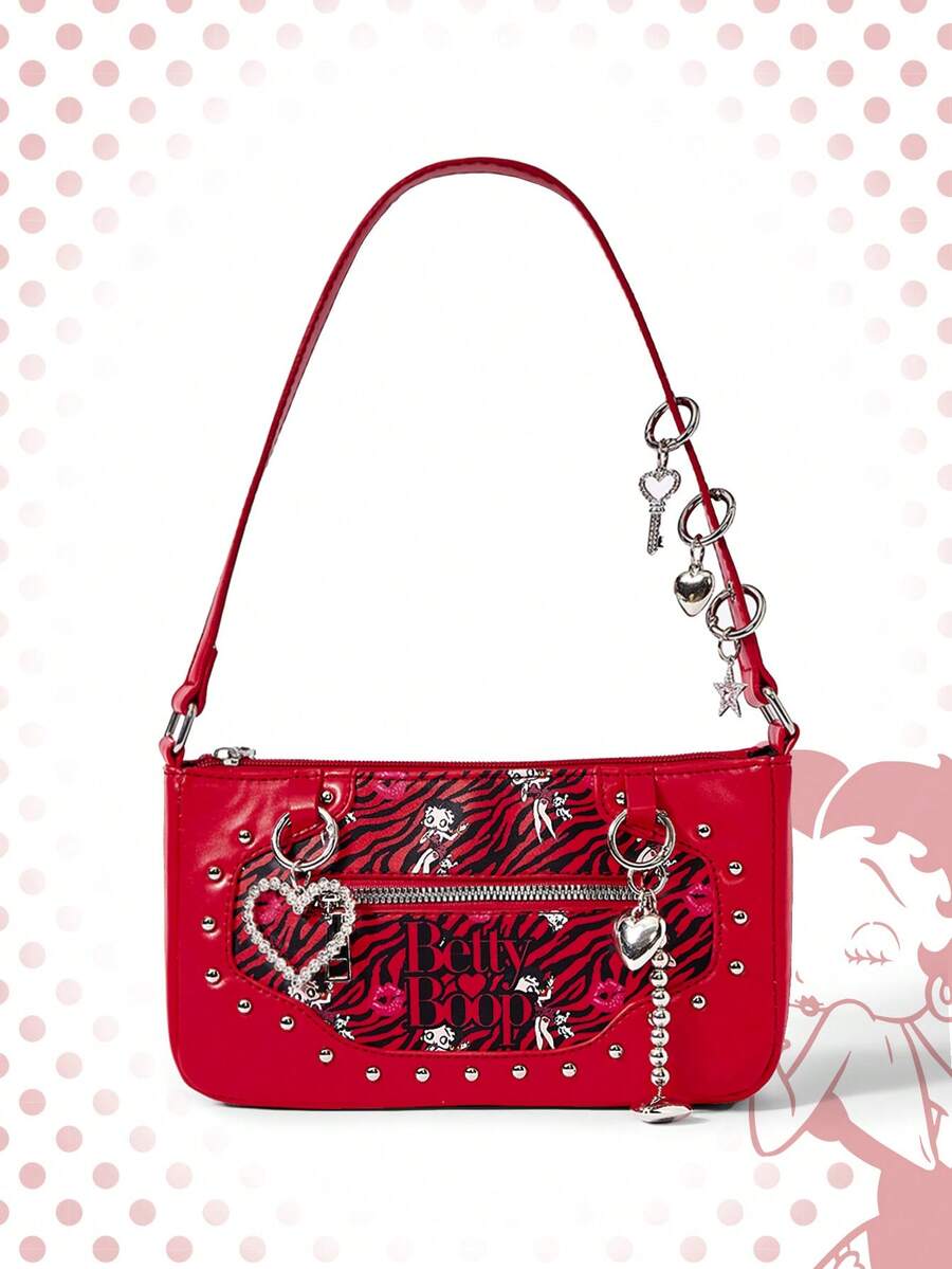 Betty Boop | ROMWE Vintage Y2K Zebra Patchwork Schultertasche mit Herzanhänger, Metall Kette mit Nieten Geldbörse, Retro Street-Style für Alltag & Party
