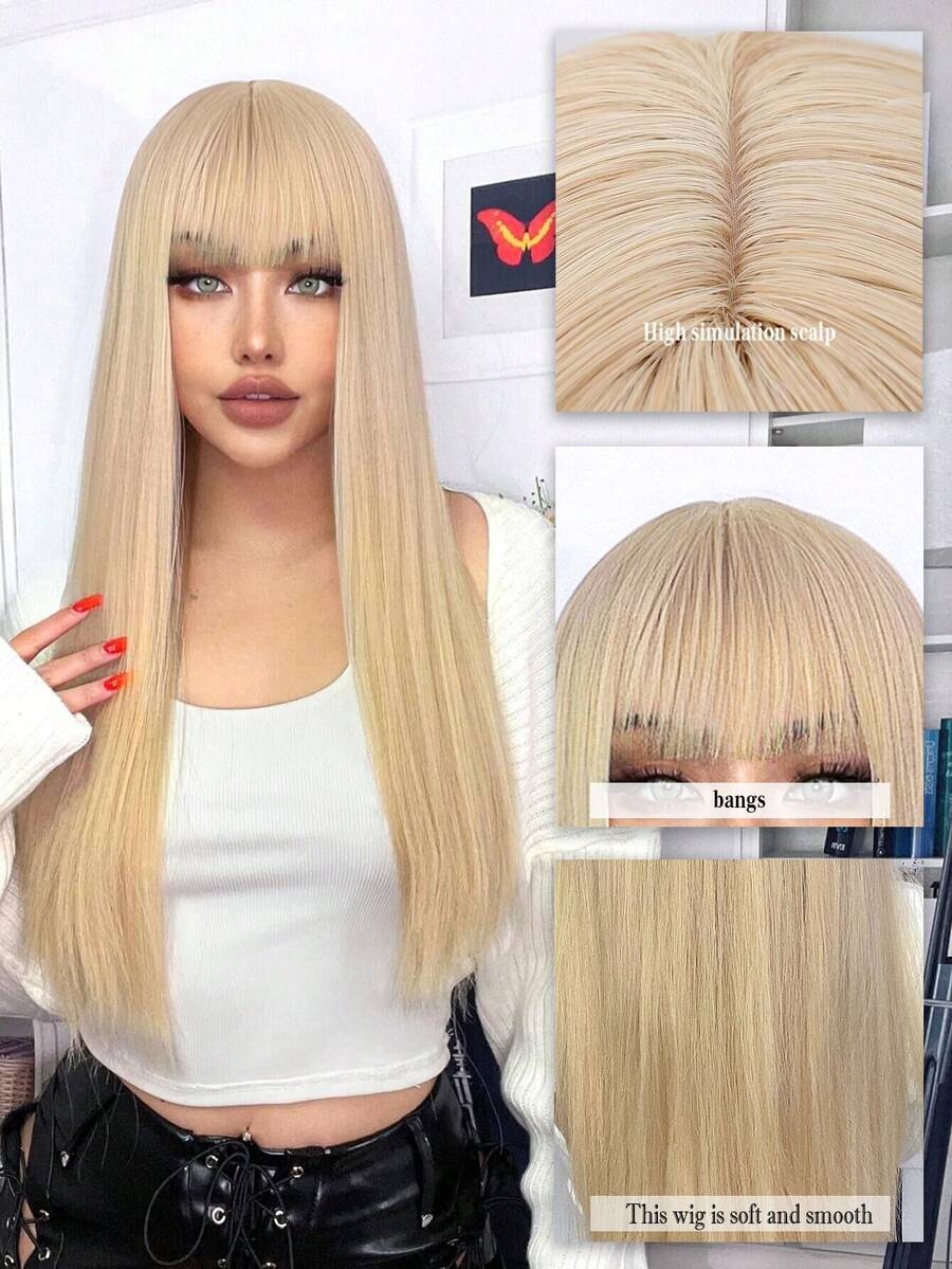26 Zoll lange gerade Perücke mit Pony aus blondem Kunsthaar, modische Damenperücke, hitzebeständig, alltagstauglich, geeignet für verschiedene Anlässe wie Weihnachten, Neujahr, Partys, Urlaub, Winter