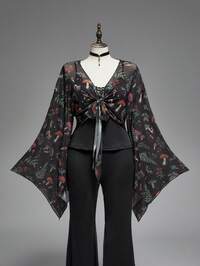 Fairycore Damen Mode Dunkelbraun Pilz Pflanzen Muster Weite Ärmel Top