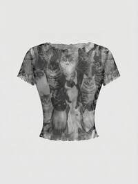 ROMWE Avant Sexy, süßes, transparentes Katzen-Muster Sommer T-Shirt Top für Frauen