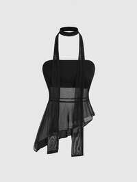 Grunge Punk Punk Nautisches Mesh Patchwork abnehmbarer High-Low Fellkragen rückenfreies Design Damen Top