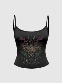 Grunge Punk Gothic dunkler mysteriöser Akademie schwarzer Schädel Motte Sonne Mond Stern Muster Frauen Trägershirt
