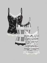 3 Stücke Y2K Vintage Musiknoten & Klavier Tastatur Muster Bodycon Spitzenbesatz Trägerhemd Set