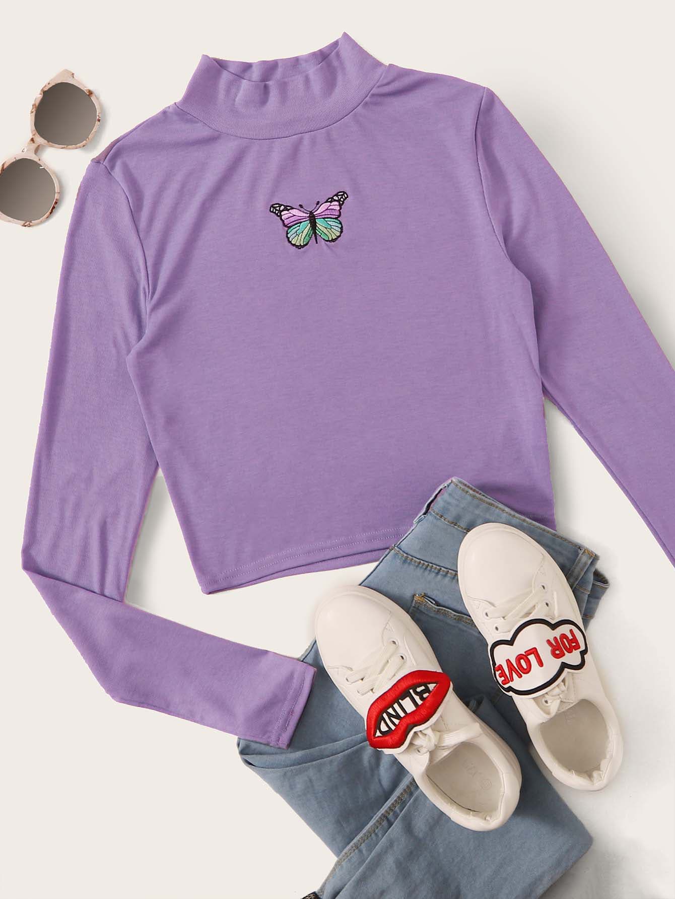 Crop T-Shirt mit Schmetterling Stickereien und Stehkragen