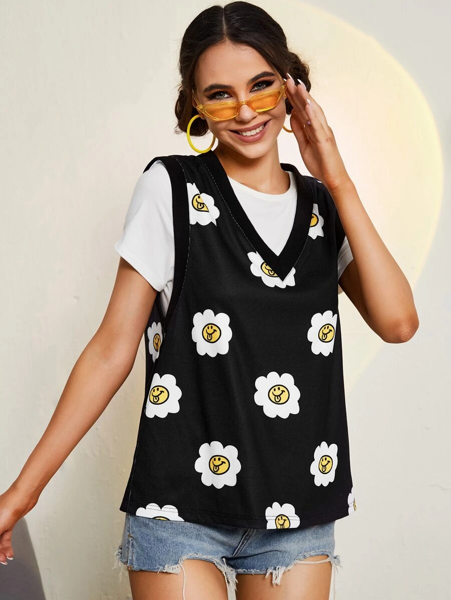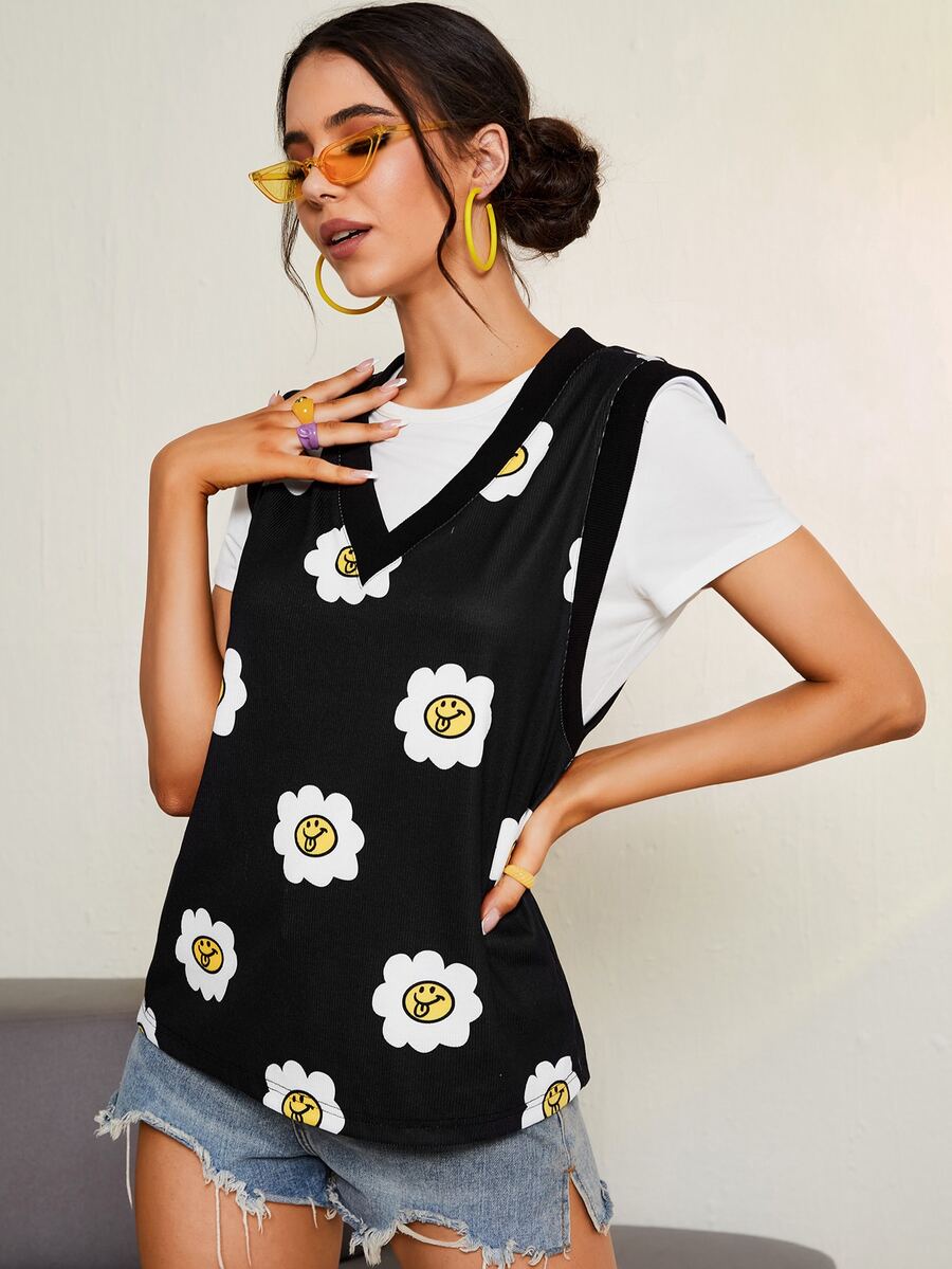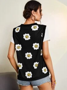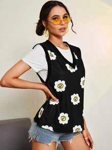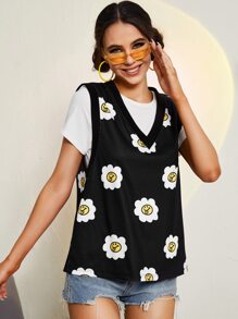Tank Top mit Karikatur & Blumen Muster und V Kragen ohne T-Shirt