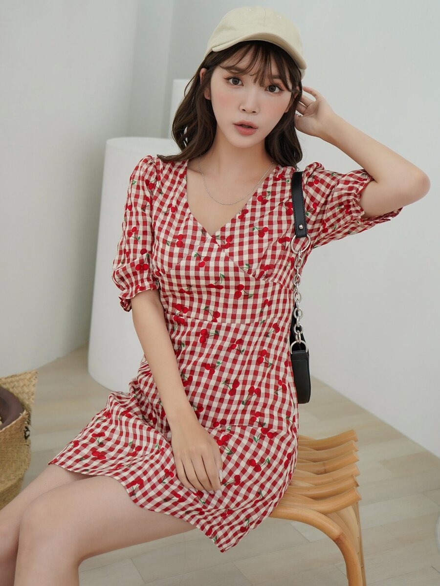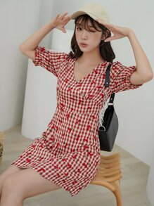 Kleid mit Kirsche und Gingham Muster, Volant Ärmeln