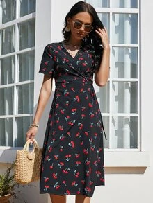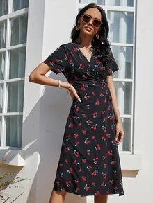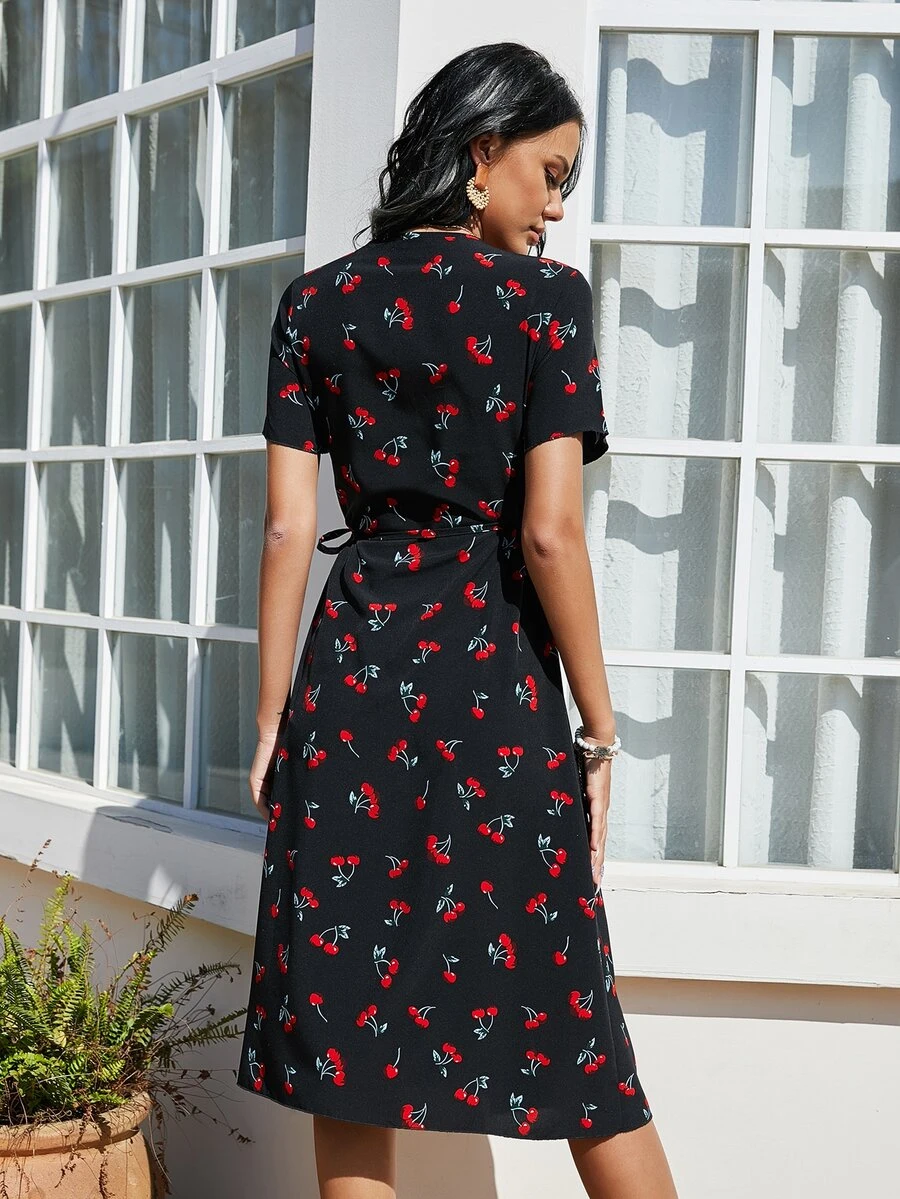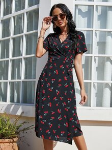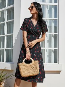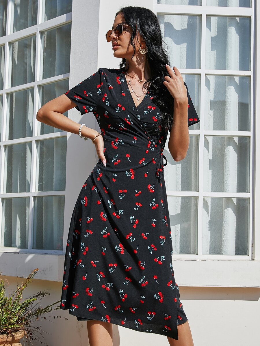 Kleid mit Kirschen Muster, Selbstband und Wickel Design