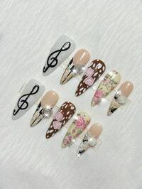 Anime 10 süße rosa Schleifen, Rosen, Musiknoten, Flügel, Sterne, Kreuz Liebeselemente handgemachte Fake Nägel + 3 doppelseitiges Klebeband, Y2K Stil Diamant, kontrastierende Farbnägel, abnehmbare lang mandelförmige Tragenägel, geeignet für Partys, Tänze und den täglichen Gebrauch. Anime 10 Stück Y2K Retro Stern, Polka Punkt, Streifen, Pop Art, Grunge, Musiknoten dekorative Künstliche Nägel, handgefertigt, geeignet für Uni, Musikfestivals, Dates, usw.