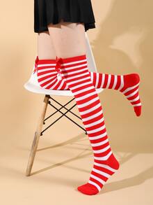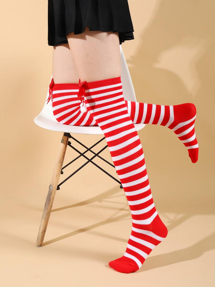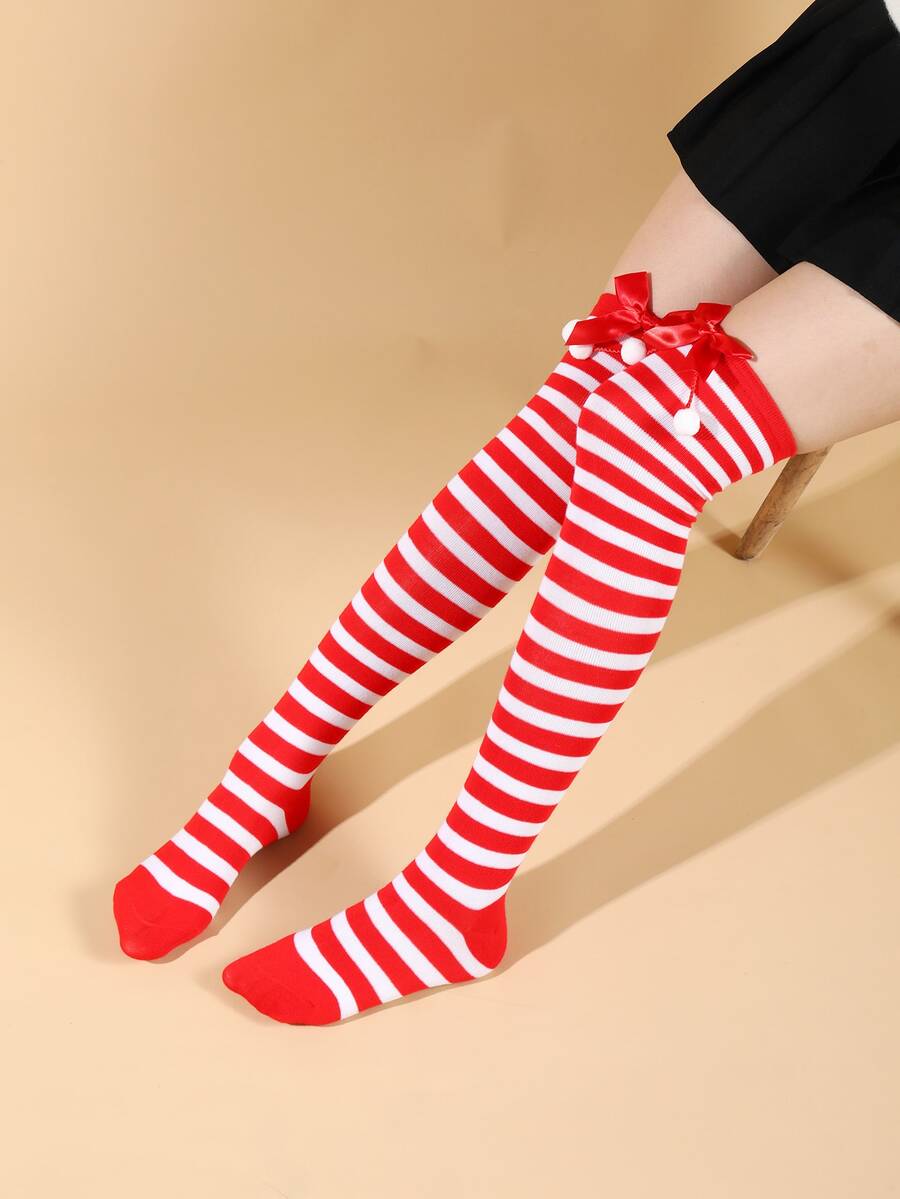 Überknie Strümpfe mit Weihnachten Streifen Muster, Schleife & Pompons Dekor