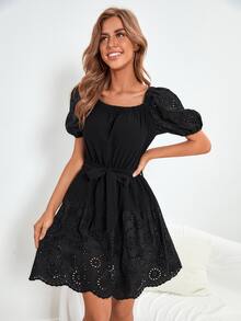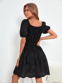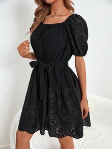 Kleid mit Gürtel, Kontrast Öse Stickerei