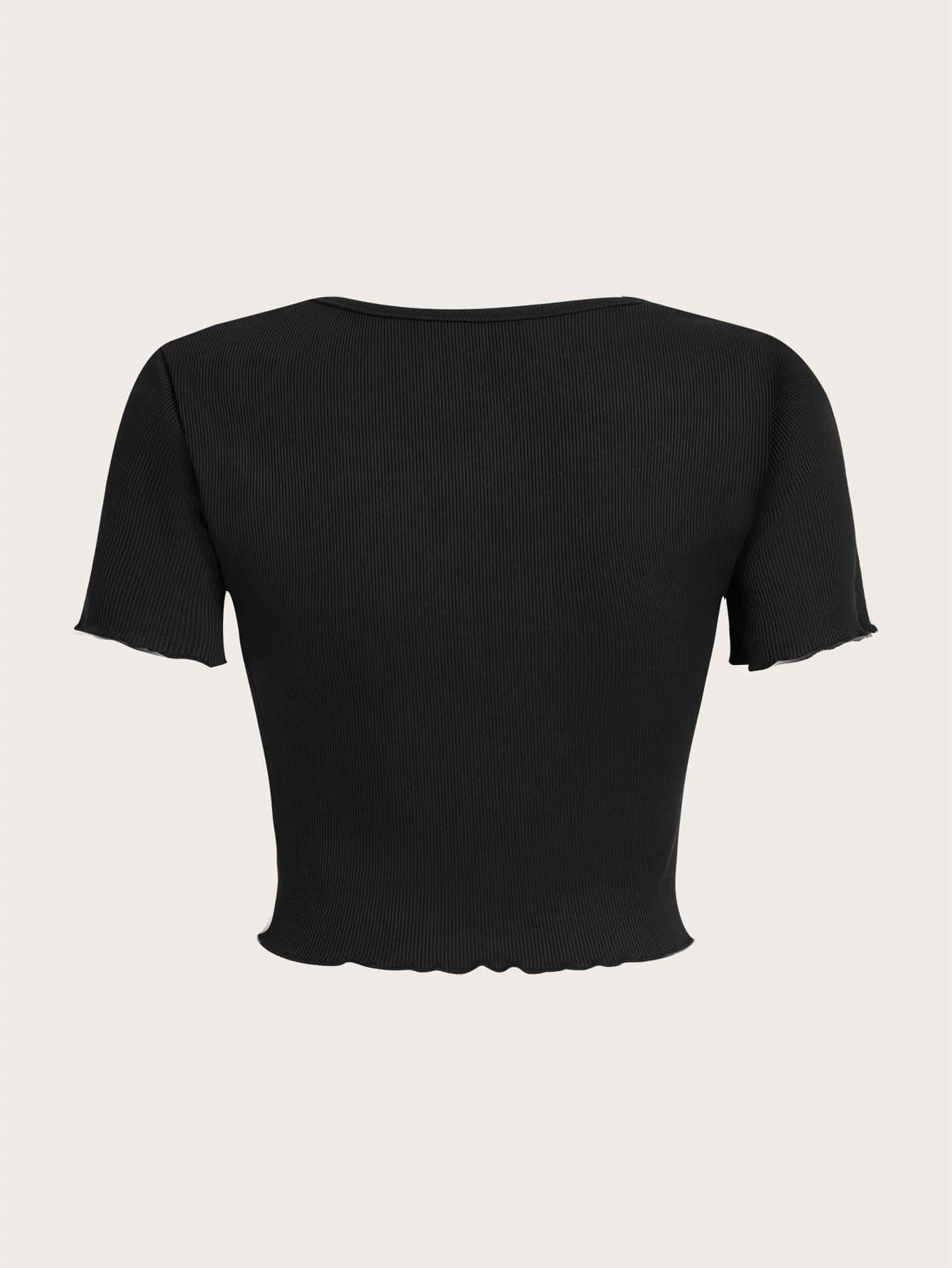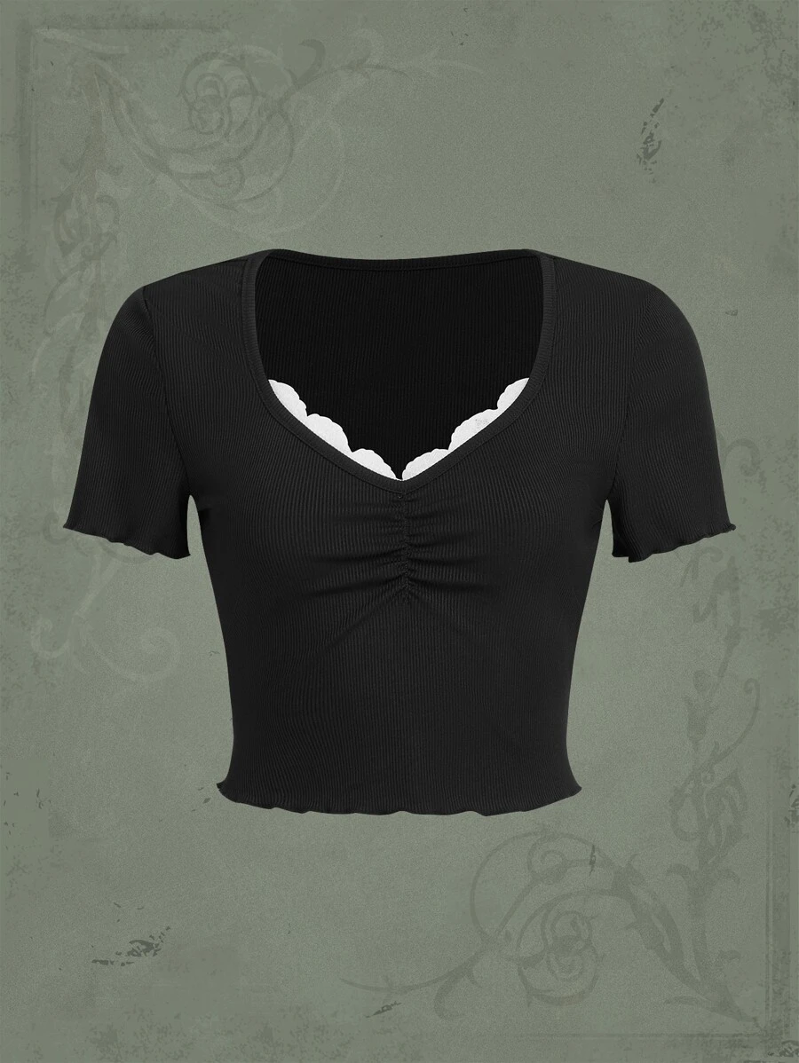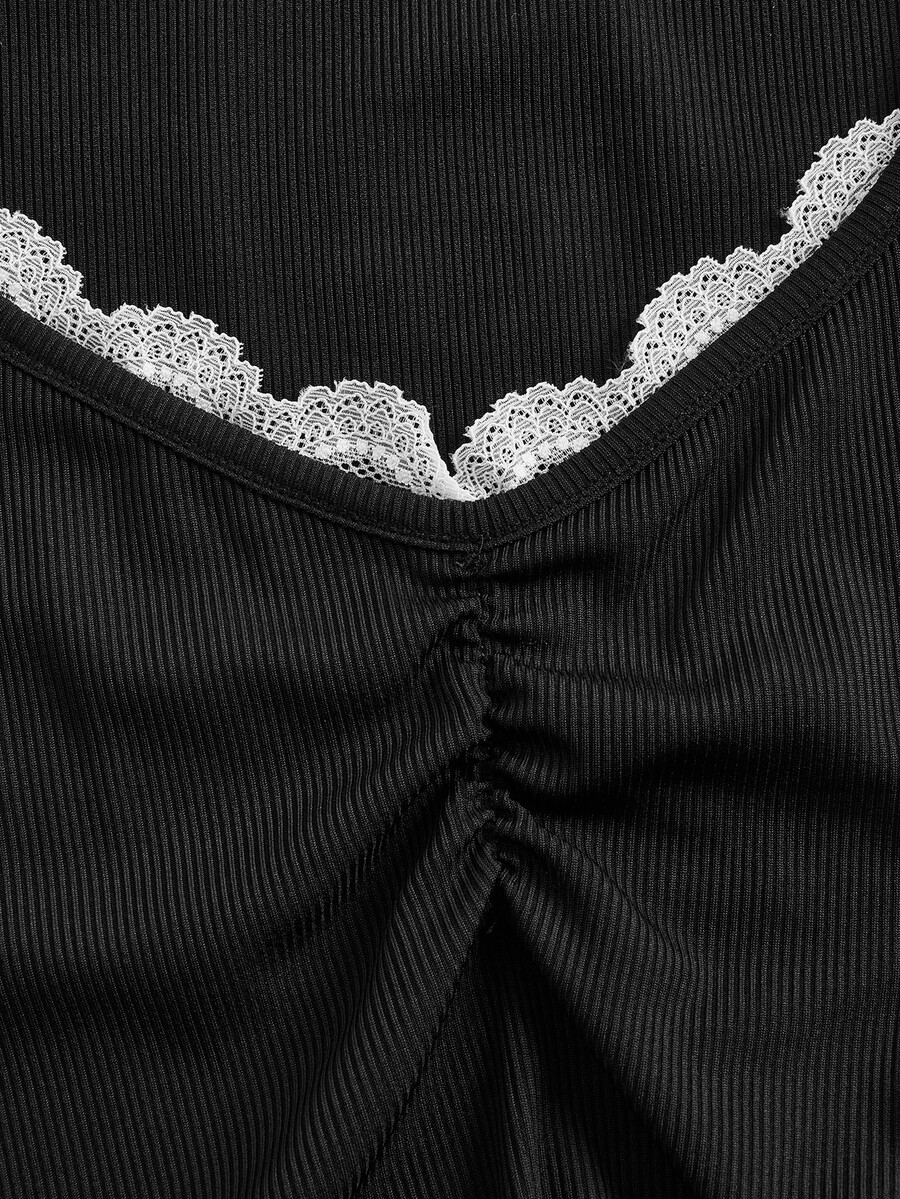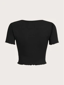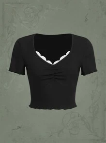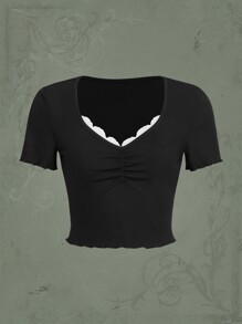 T-Shirt mit Kontrast Spitzen, Rüschen, Wellensaum