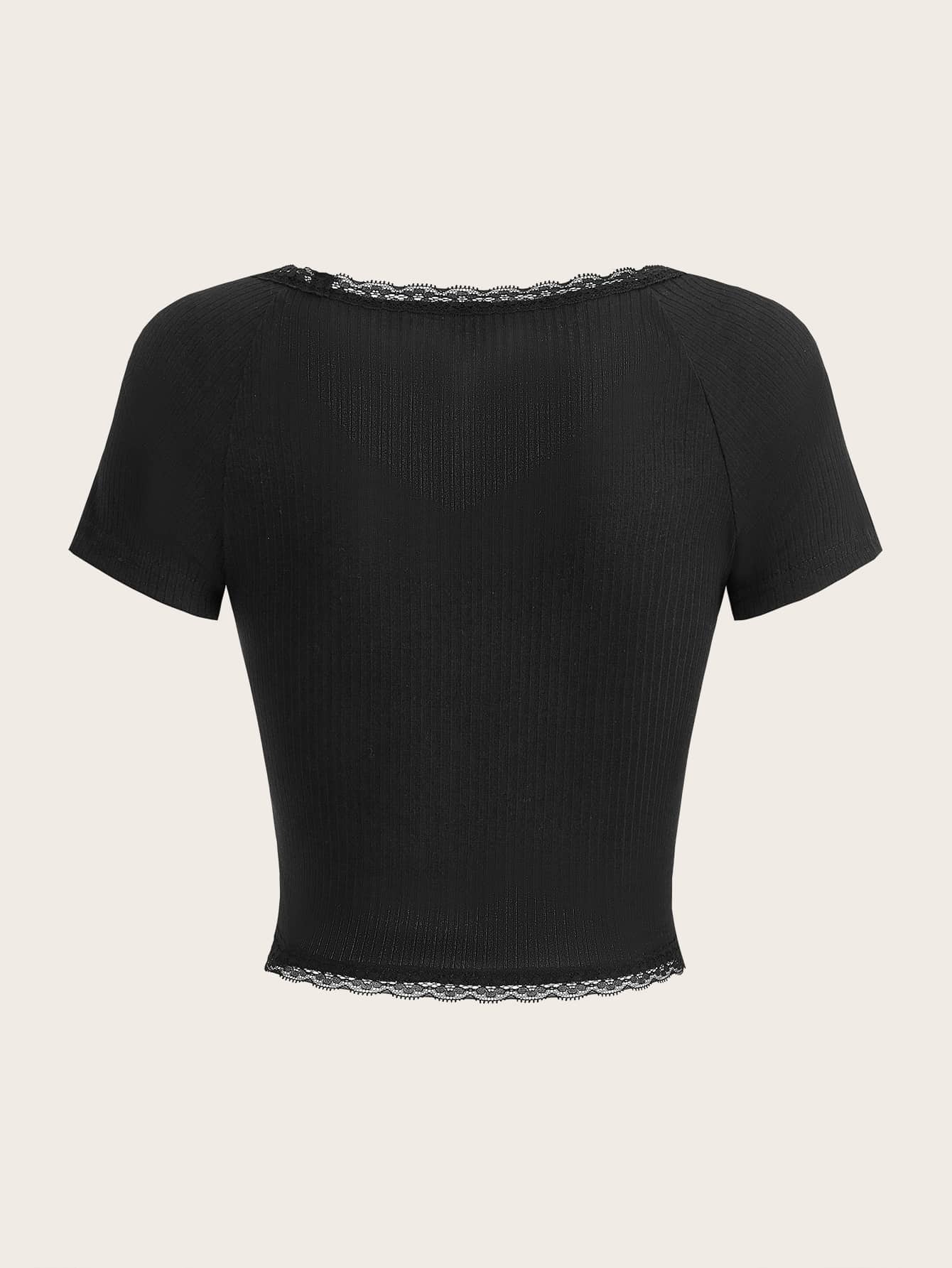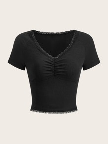 T-Shirt mit Kontrast Spitzen, Rüschen,