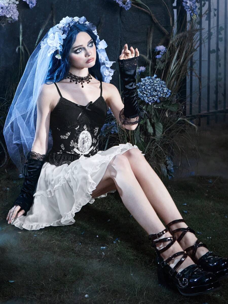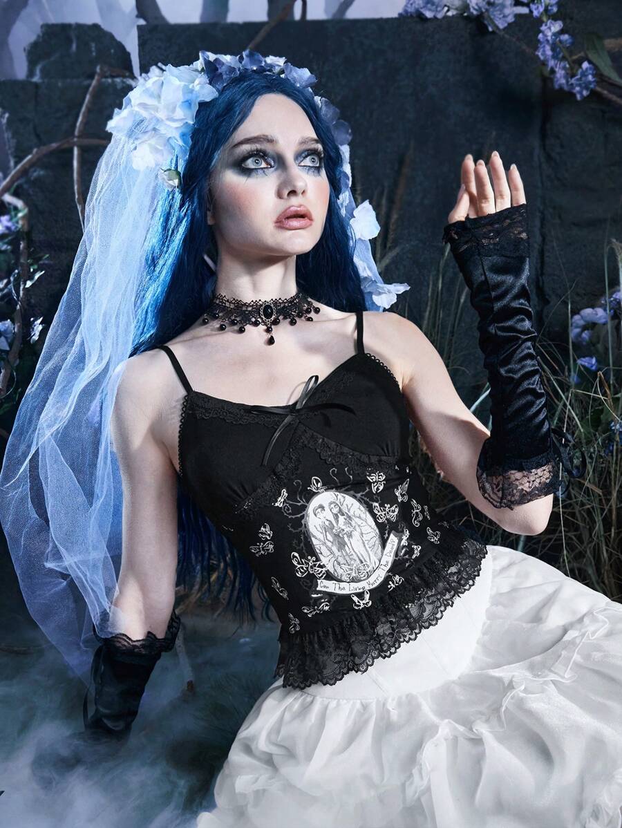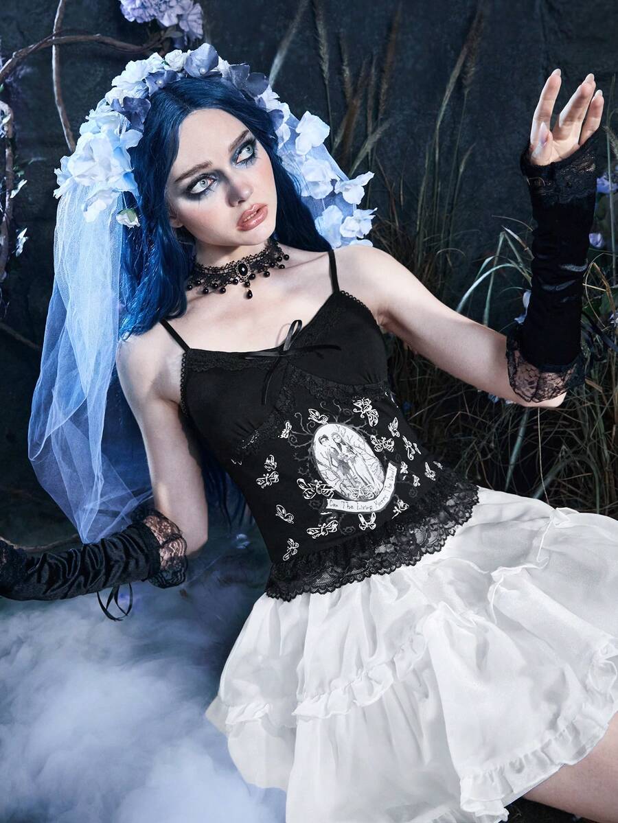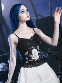 Corpse Bride | ROMWE Cami Top mit Figur Muster, Kontrast Spitzen,