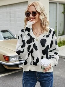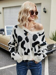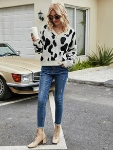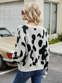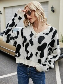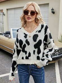 Drop Shoulder Pullover mit Kuh Muster