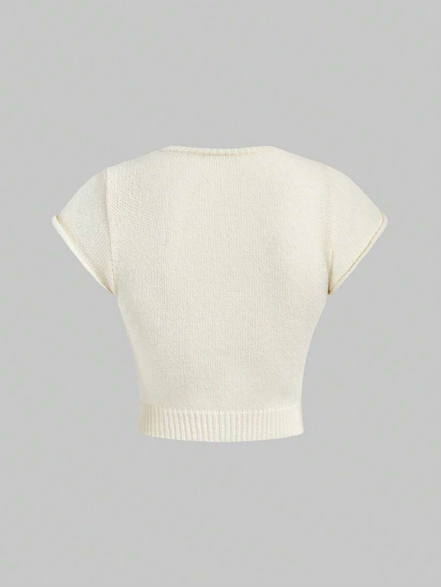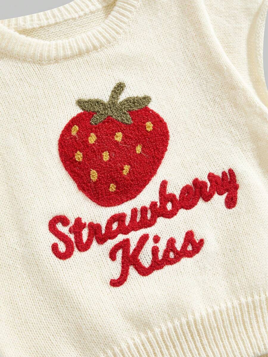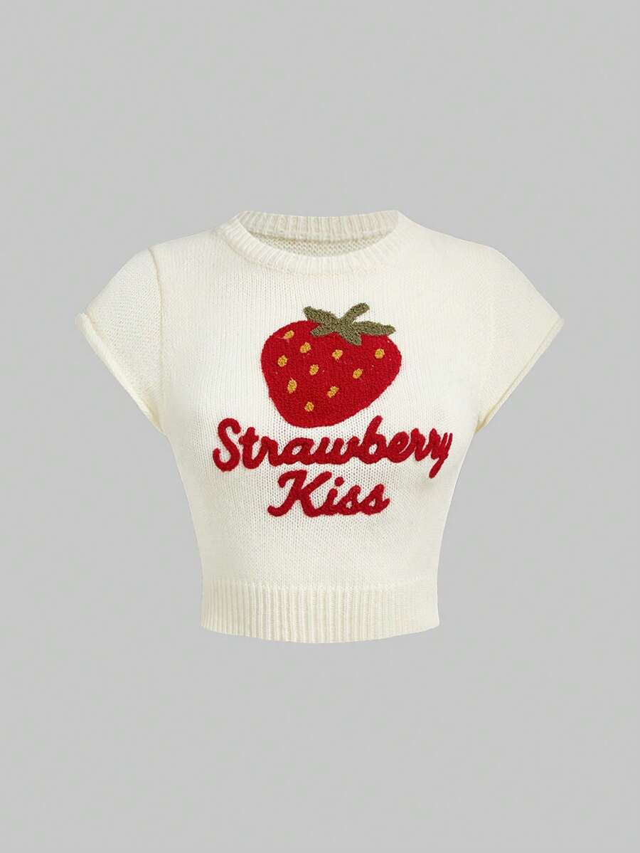 Süßer Retro Erdbeere Stickerei Strick Crop Top, bauchfreier Kurzarm Pullover mit jugendlichem Flair, vielseitiger Strick Cardigan