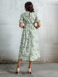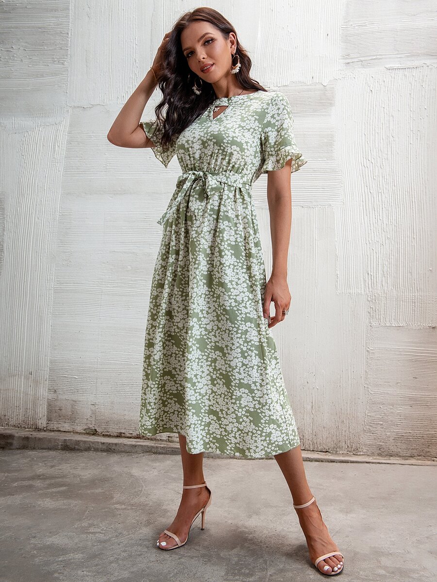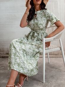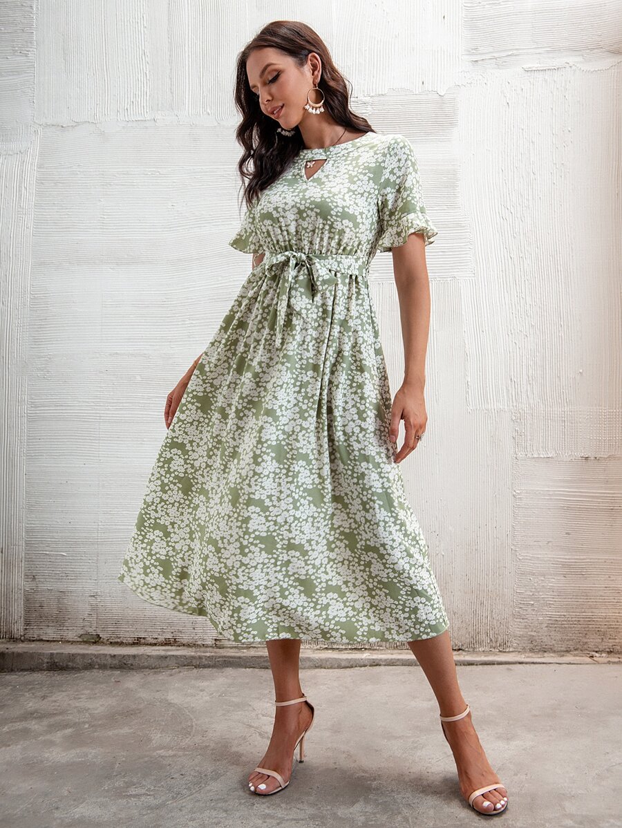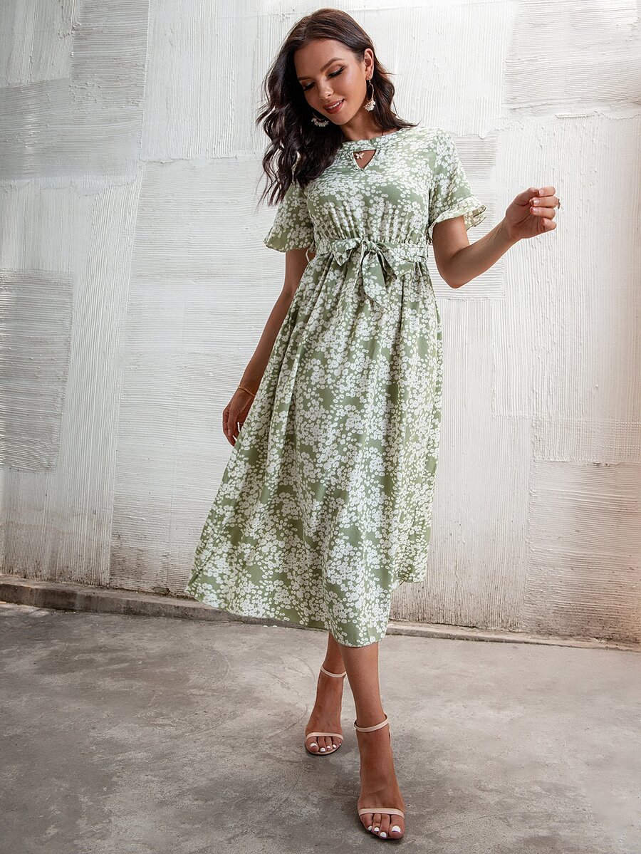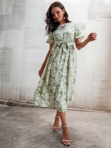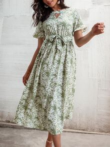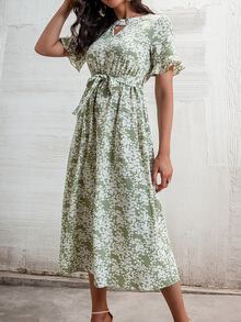 Kleid mit Gürtel, Blümchen Muster, Schlüsselloch Kragen