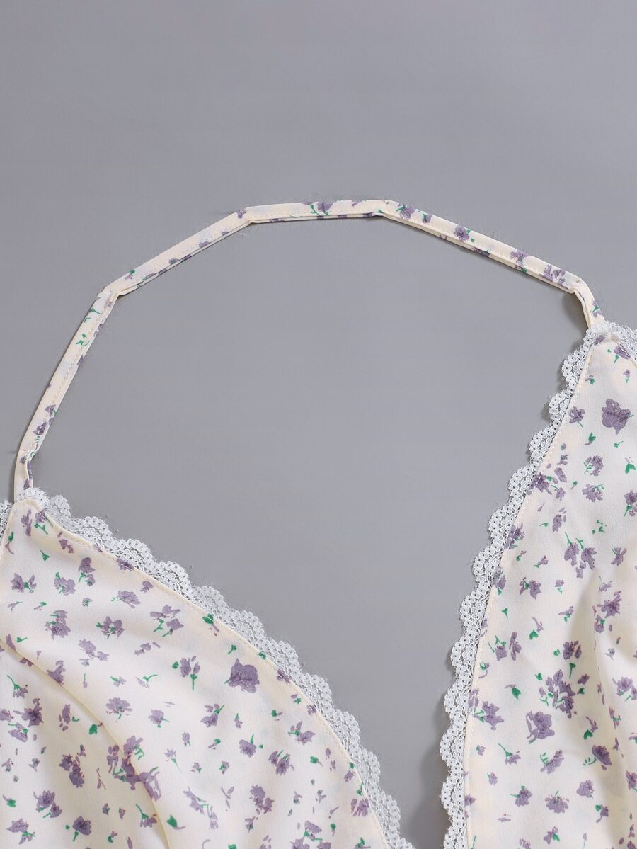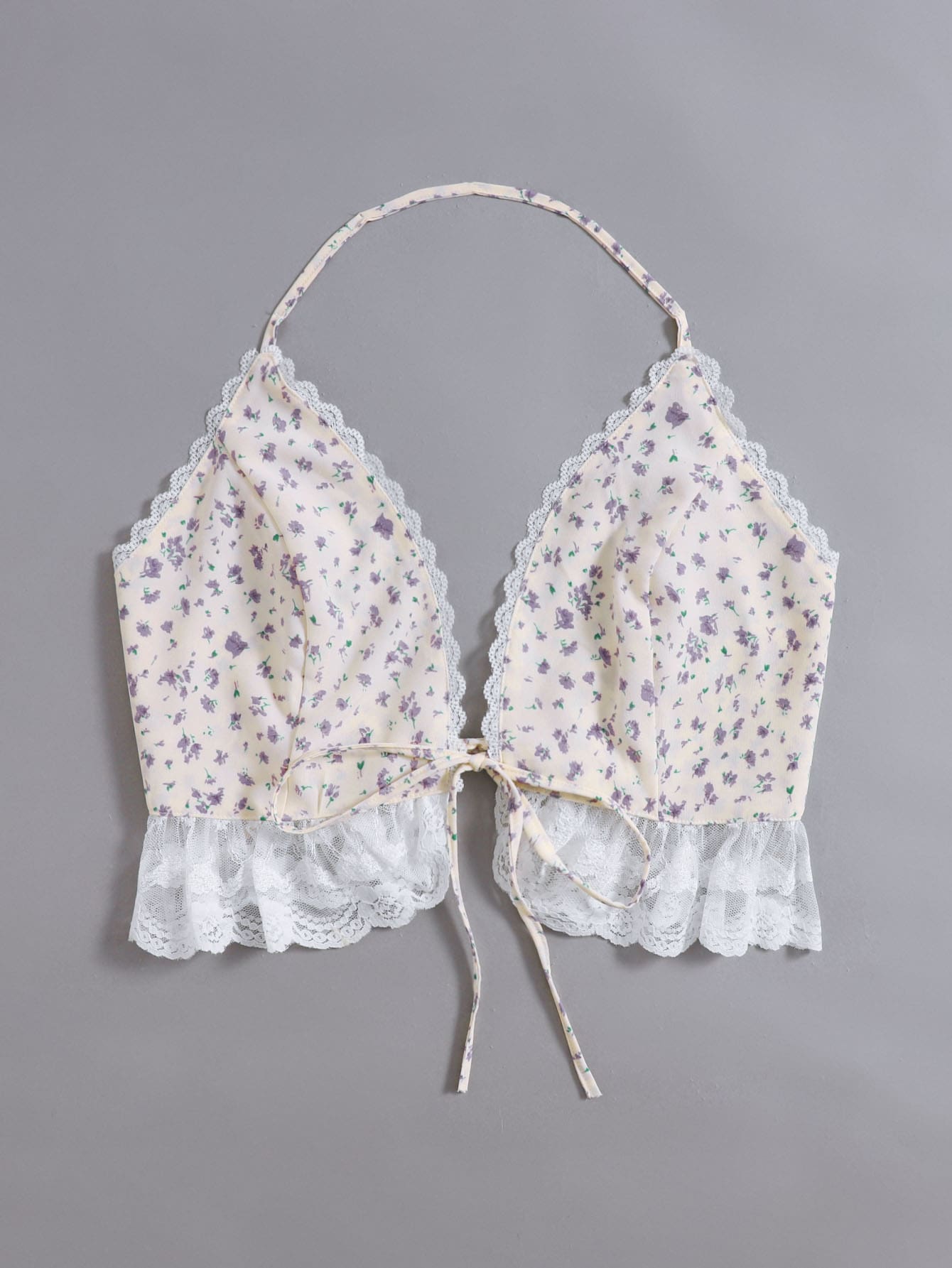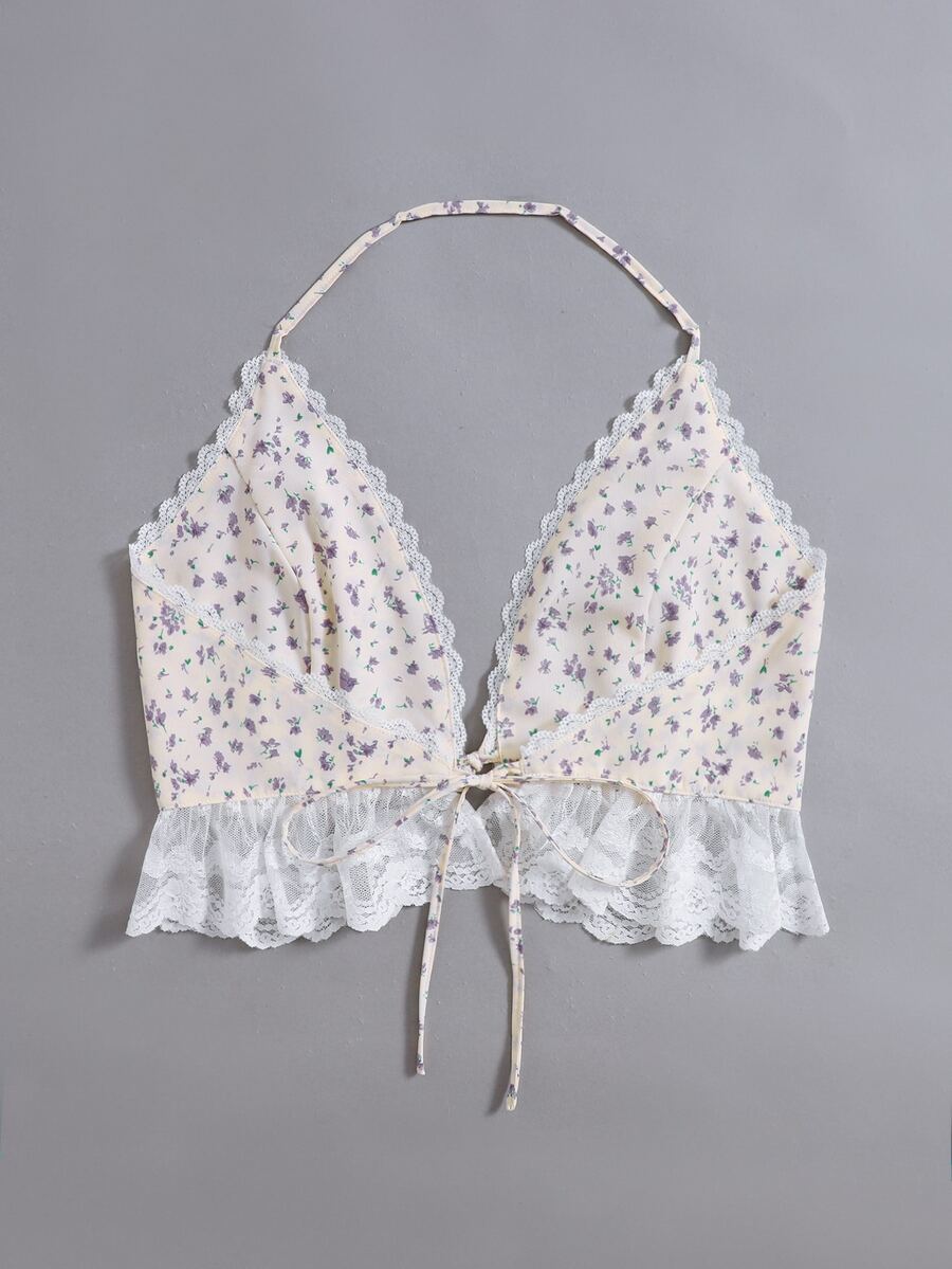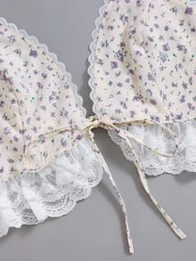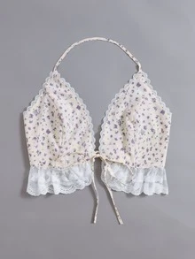 Top mit Blümchen Muster, Kontrast Spitzen und Band vorne