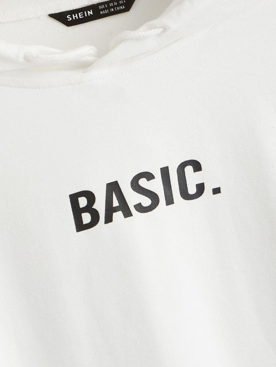 Kapuze mit Kordelzug Detail, sehr tief angesetzter Schulterpartie und Buchstaben Grafik