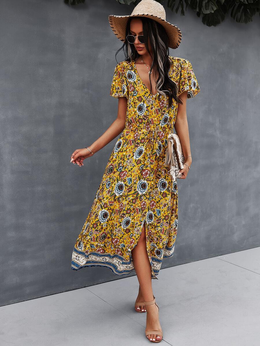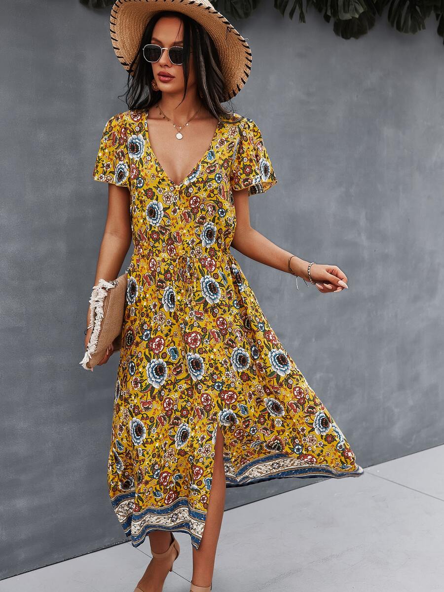 Kleid mit Schnürung-Taille, Blumen Muster und Schlitz