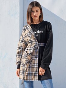 Drop Shoulder Pullover mit Buchstaben Grafik, Karo Muster und Gürtel