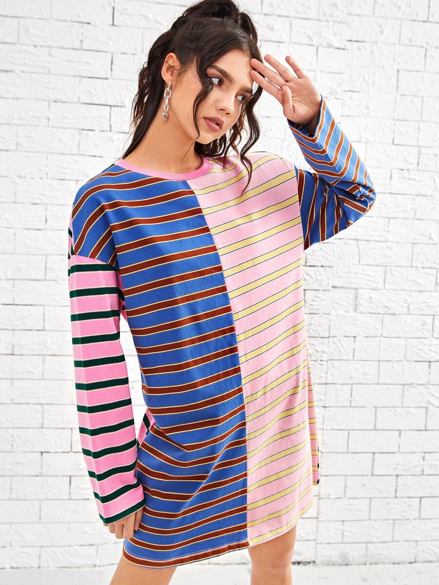 Kleid mit Drop Shoulder Streifen Muster, Farbblock