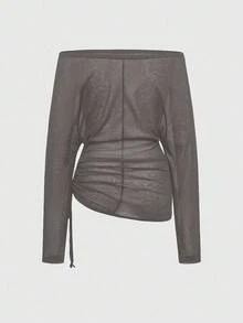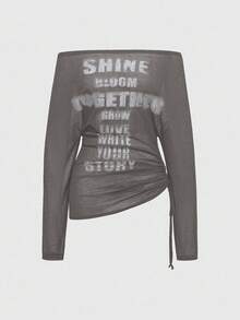 EDITION Kreuz- und Buchstaben-Muster Carmenausschnitt Langarm T-Shirt für Frauen, romantischer Punk-Stil