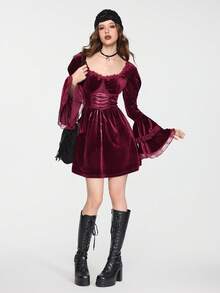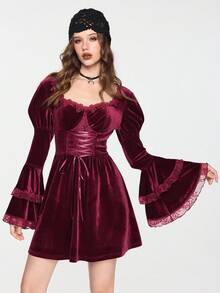 EDITION Halloween Hexe Samt Mysteriöses Glockenärmel Schnürung Taille Midi Kleid für Frauen