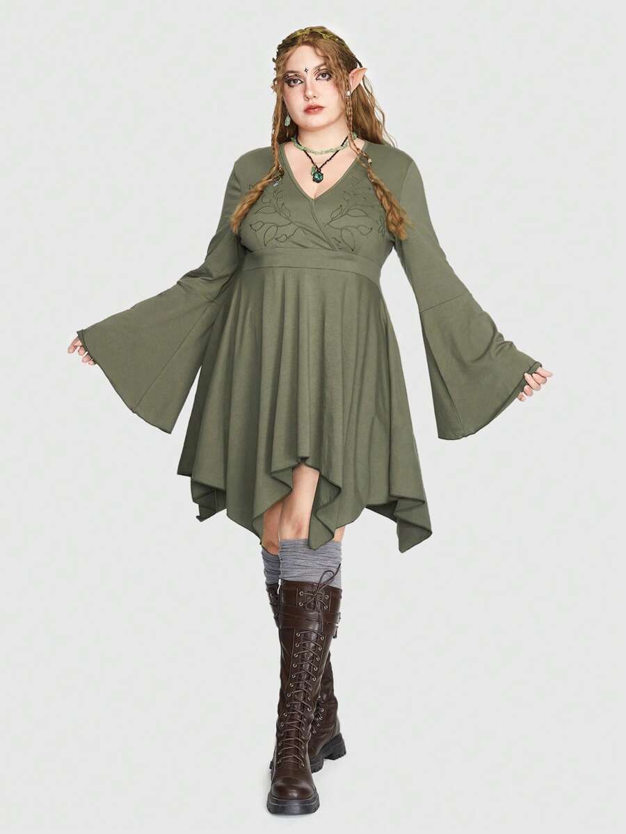Fairycore Große Größe Kleid mit Kontrast Spitzen, Trompetenärmeln, Zipfelsaum