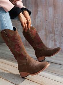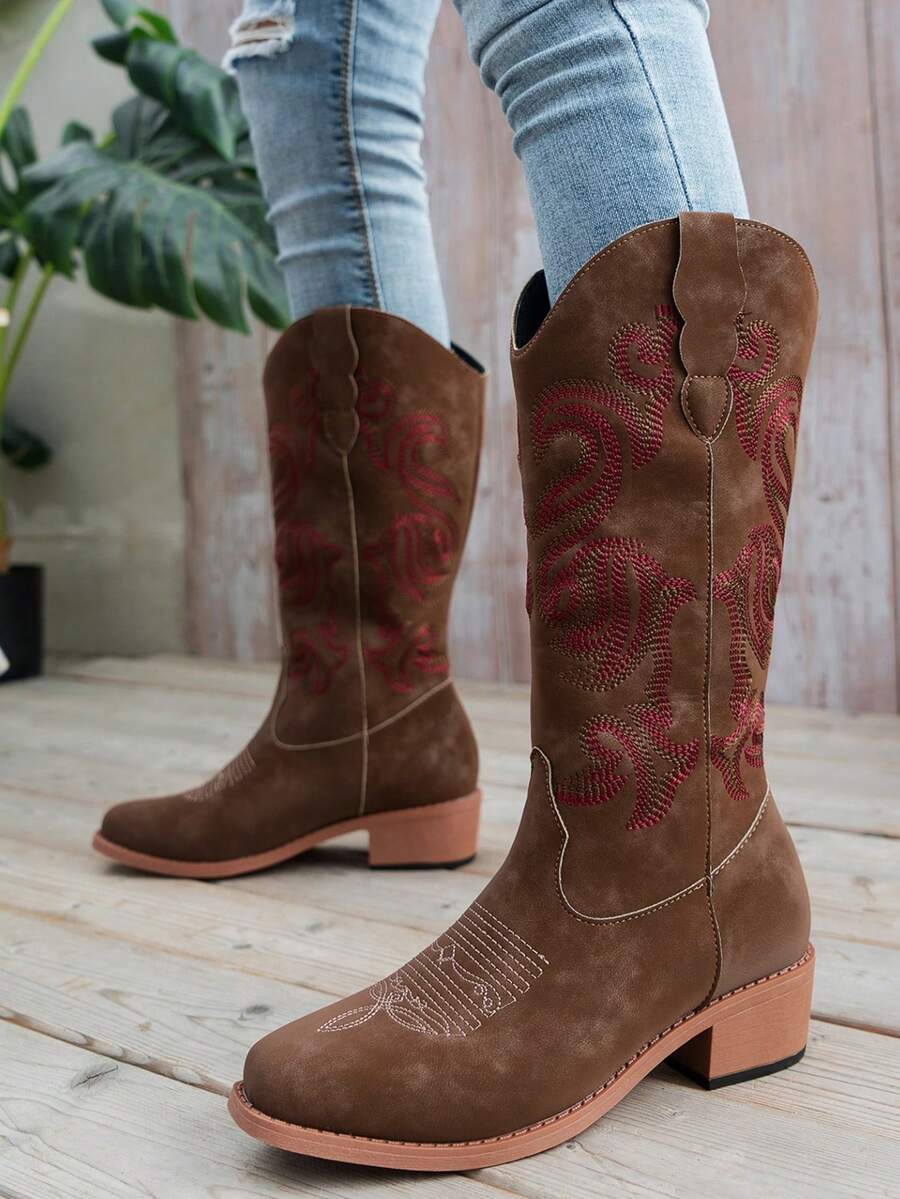 Fairycore Western Style Cowboy Stiefel Mit Klobiger Ferse, V-förmiger Gestickter Knie Hohe Reitstiefel, Retro-stiefel